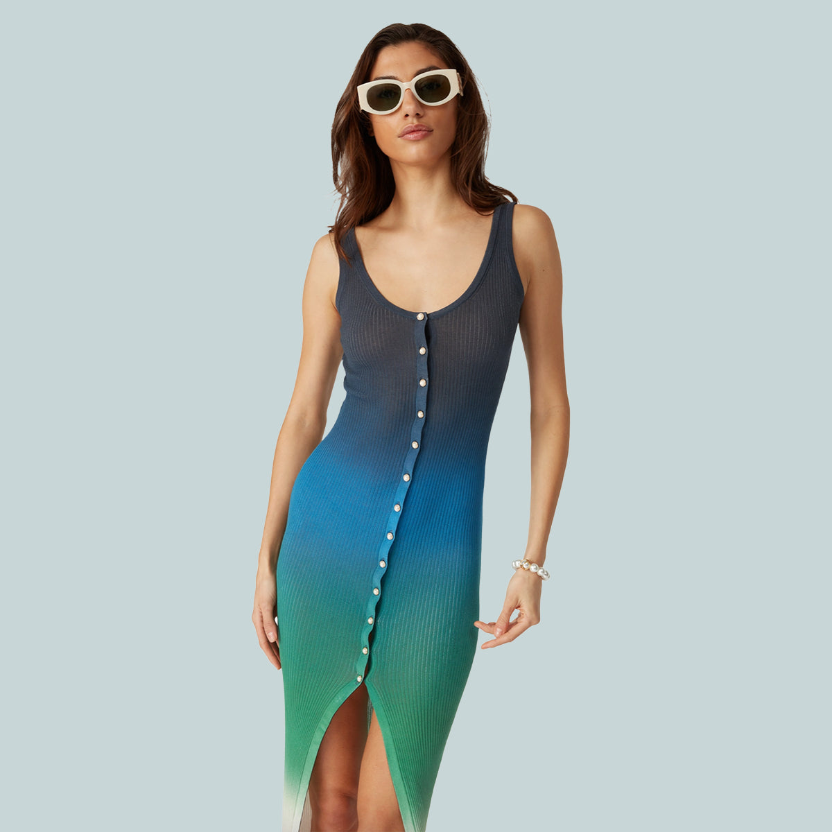 The gradient rib dress is a printed sleeveless design featuring the house's seasonal vibrant gradient print of deep inky blues transitioning through shades of pink to vibrant orange, representing the summer’s shifting sky, sinking into the ocean’s horizon, alluding to nature’s ever-changing canvas. Completed with button closure, a scoop neckline, narrow shoulder straps, and signature gold rim pearl buttons.