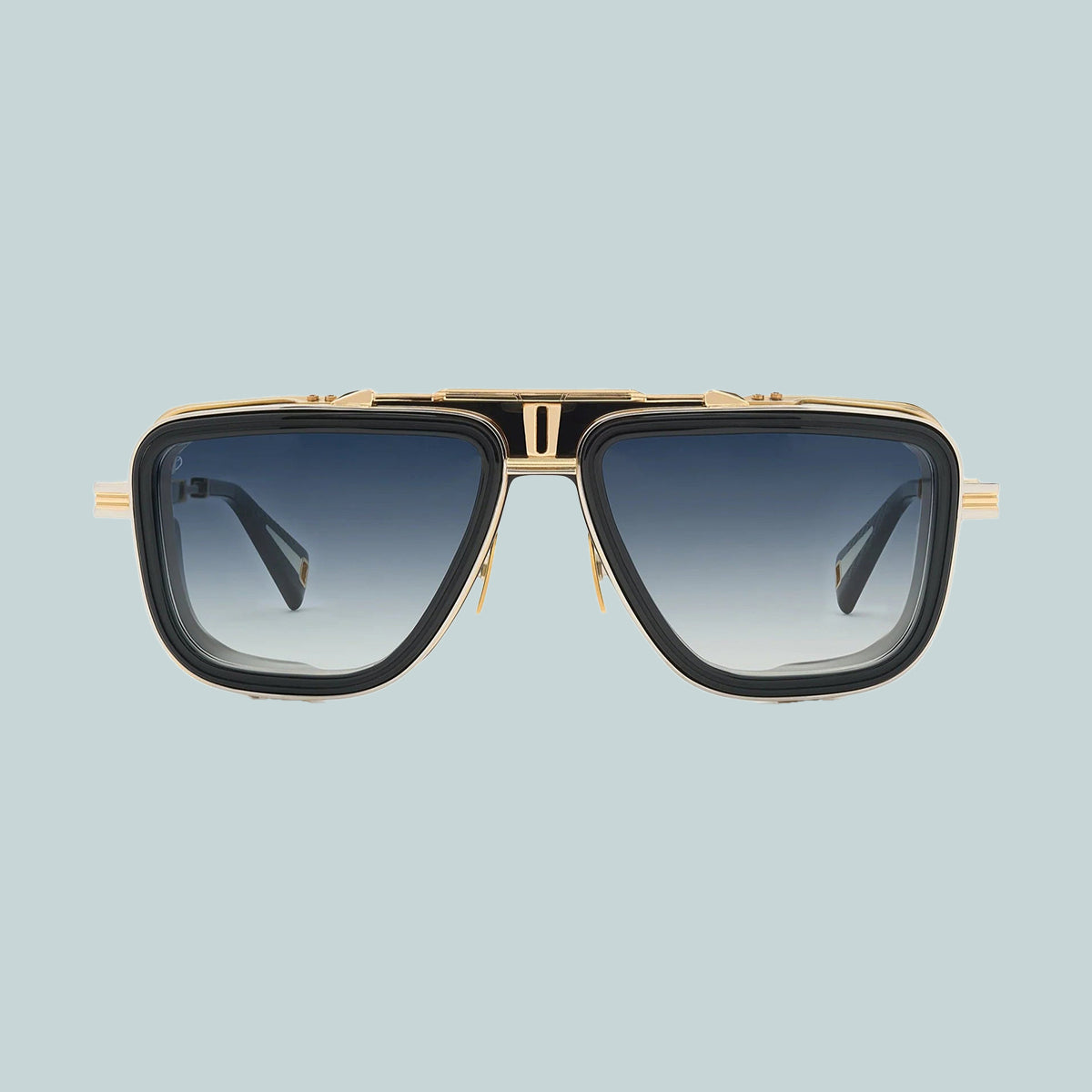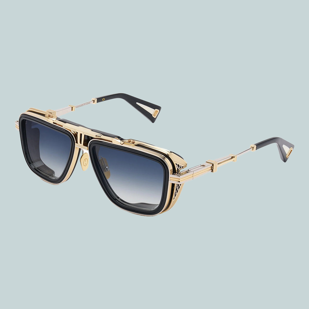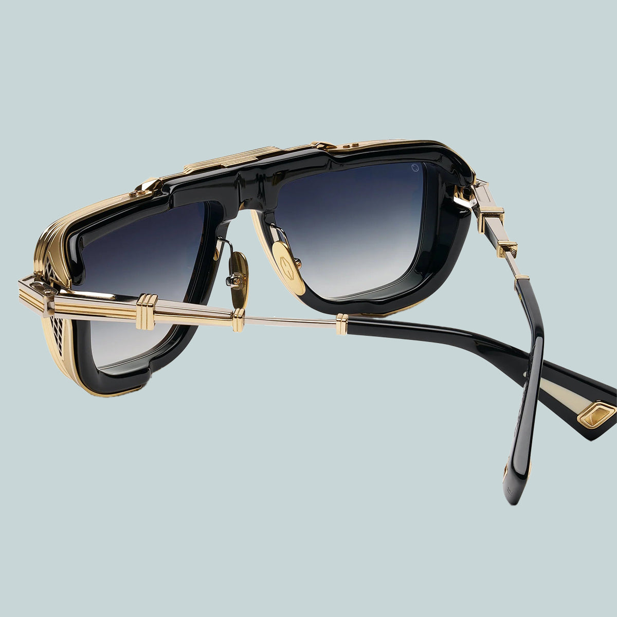 Combination titanium and acetate construction utilizing a cotton extrusion method with custom complex coloration. A 20mm hand-carved front outfitted with four base lenses, 4mm ti rim stock and exposed two-tone ti mesh shields. A billet vertical grille system fuses the connection between the ti nose bridge and brow bridge.