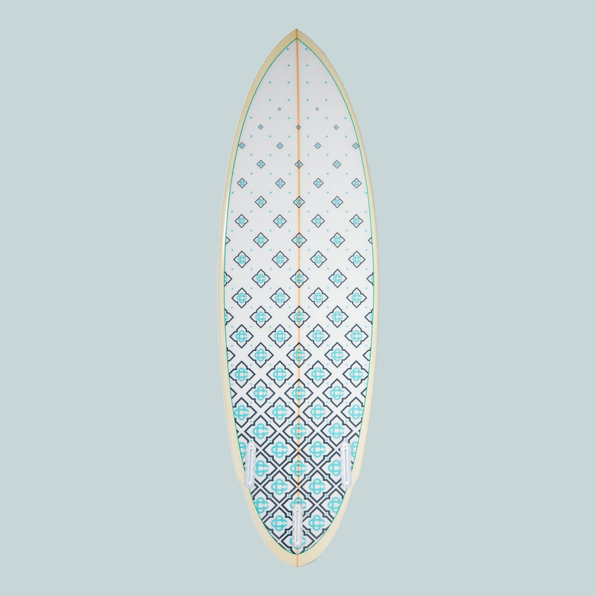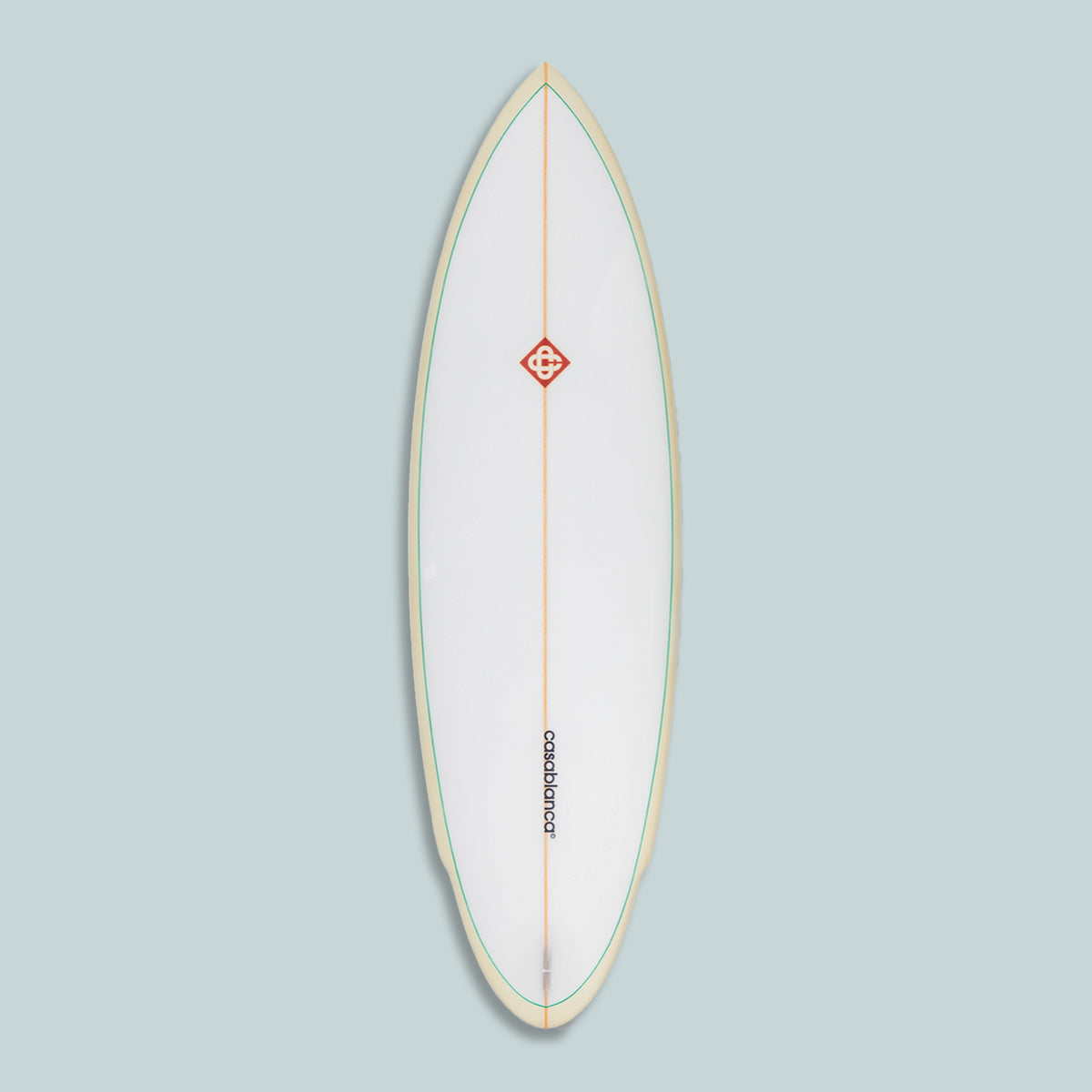 The Casablanca surfboard is crafted from premium fibreglass, polyurethane foam and polyester resin and features the house's Degrade monogram print on the bottom and Casablanca branding with the signature diamond logo on the deck. Completed with a wood stringer, a white deck with a mint green border and light yellow rails. The Casablanca surfboard measures 178.2cm (from nose to tail) x 53cm (from rail to rail at the widest point). This item is not supplied with fins or leash.