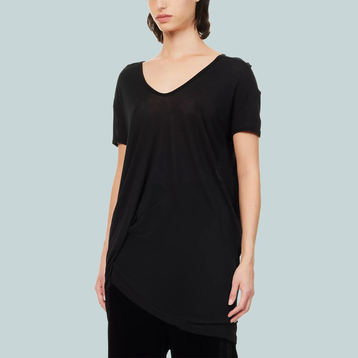 this hiked t is below-hip length with a loose fit. it has a soft v neck, short sleeves, and a single seam running down the center back spine. it features a fold on the right hip creating draping and an asymmetrical hemline.