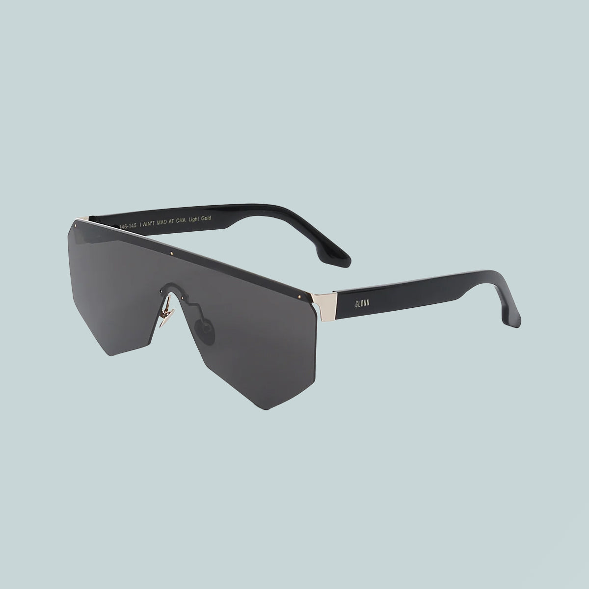 A rimless shield sunglass with a geometric silhouette. Acetate covered temples for comfort. Metal nose pads.