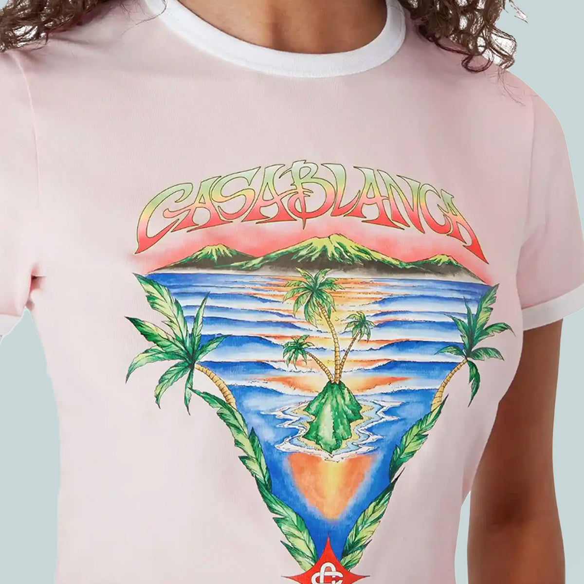 he Innocence Triangle baby tee features an ocean scene at sunset with an island in the centre, rendered in a style influenced by classic surf t-shirt art. The artwork captures the golden hour's ethereal beauty over tropical waters, presenting an idealised vision of beach paradise through the house's refined sport-leisure lens. Completed with a classic crew neck, short sleeves, and a slim fit that embodies the house's refined approach to casualwear.