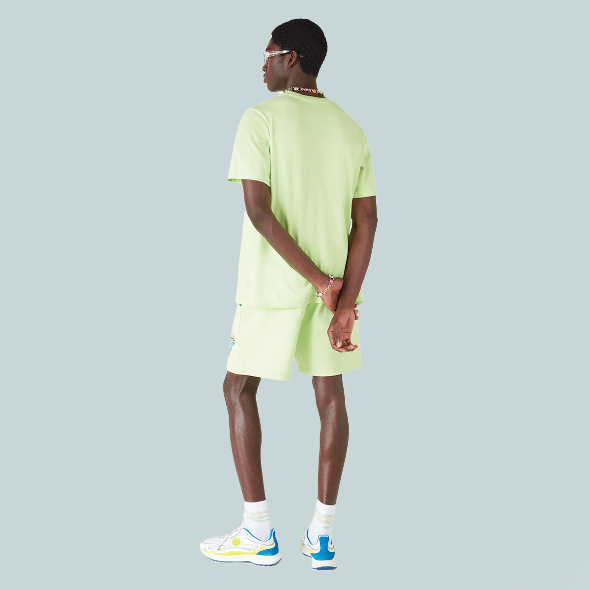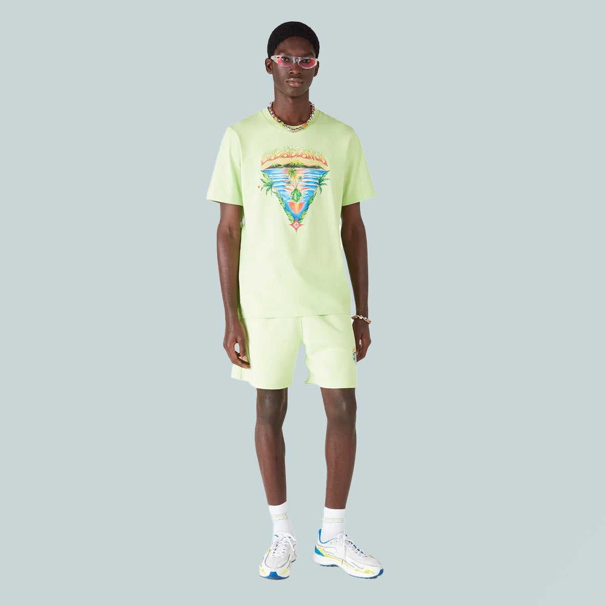 The Innocence Triangle sweatshort is a sophisticated design featuring an ocean scene at sunset with an island in the centre, rendered in a style influenced by classic surf t-shirt art. The artwork captures the golden hour's ethereal beauty over tropical waters, presenting an idealised vision of beach paradise through the house's refined sport-leisure lens. Completed with a classic crew neck, ribbed trim detailing, and the brand's signature sport-leisure aesthetic.
