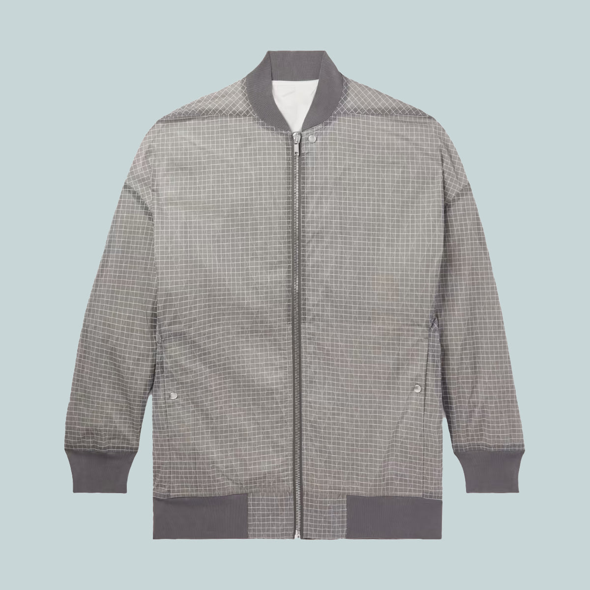 This jumbo peter flight is below hip length with a jumbo oversized fit. It has a centre front zipper, top snap detail, long sleeves and low shoulders with a dropped armhole and level shoulder seams. It has two side seam pockets with visible snaps and a ribbed collar, cuffs and hem.