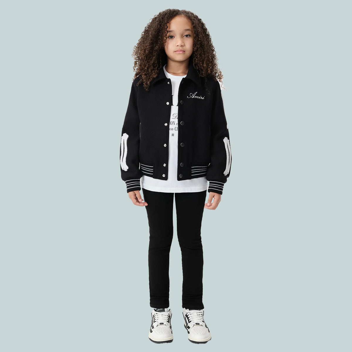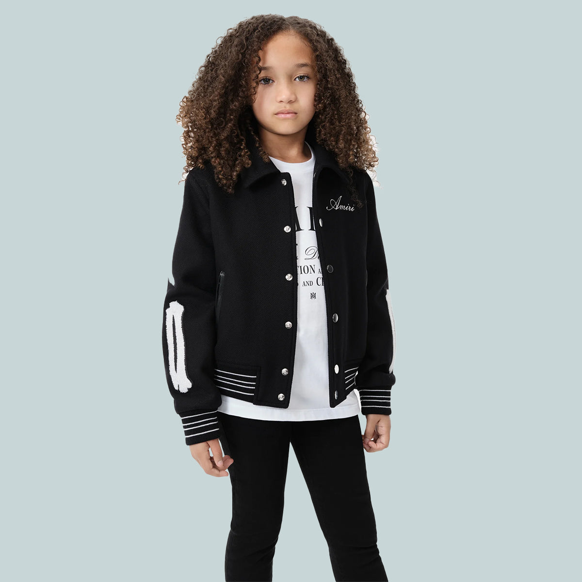 A renegade take on a classic outerwear silhouette emerges as a definitive house icon. The Bones Jacket is crafted in wool with chenille bone appliqué and finished with welt zipper pockets, striped rib accents and classic snap front closure alongside the embroidered AMIRI script logo at chest.