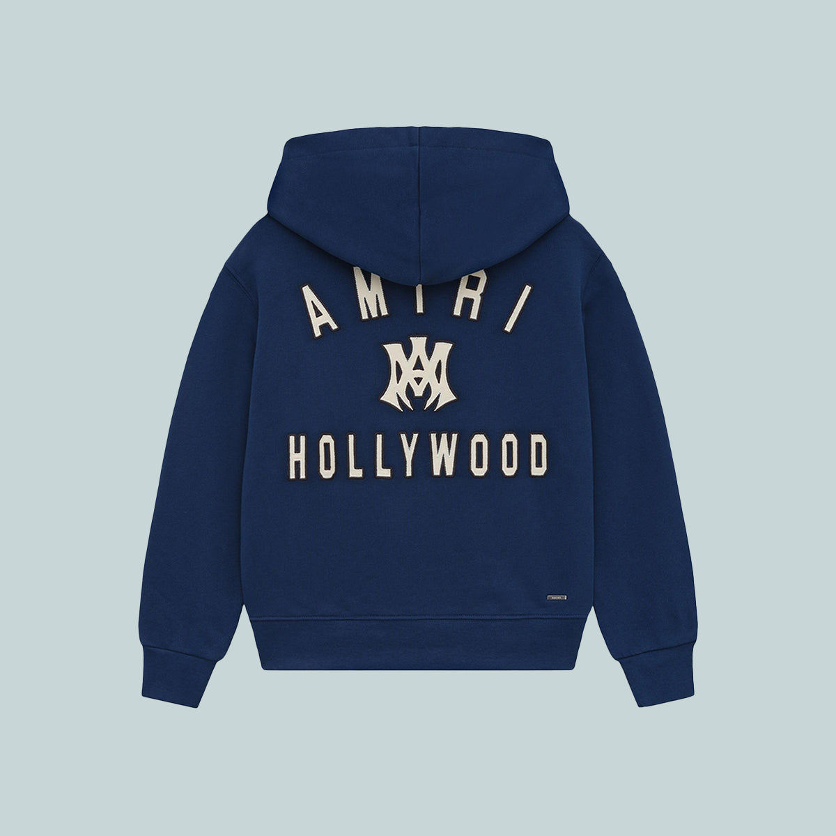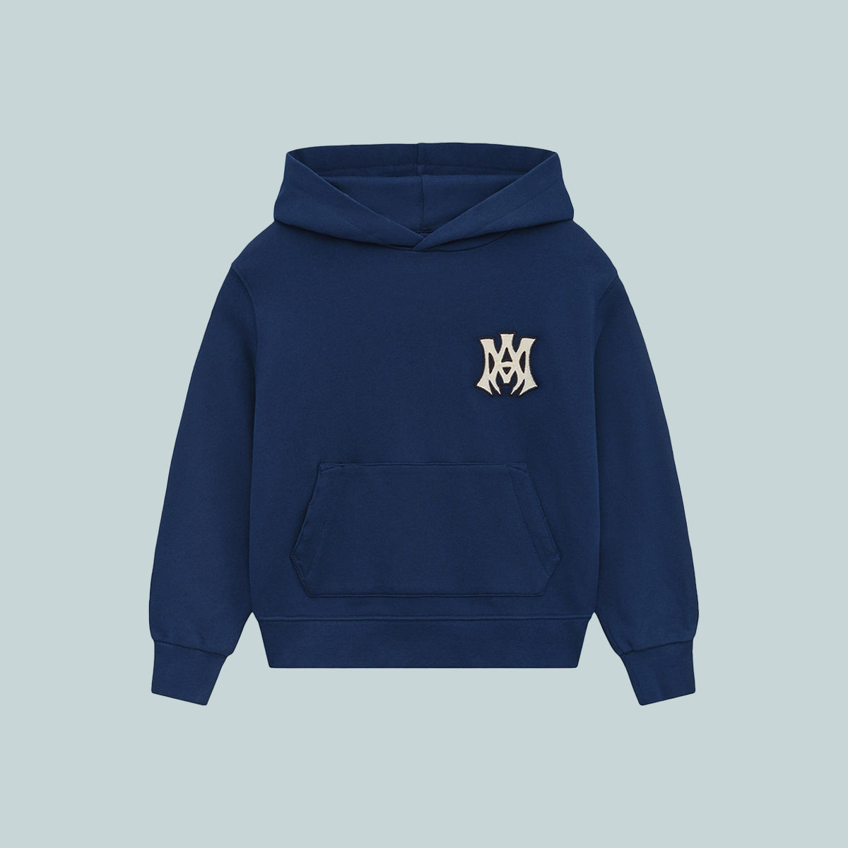 For the Pre-Spring 2025 kids' collection, graphics draw from collegiate iconography and celebrate AMIRI's home of Los Angeles. The MA Hollywood Hoodie in cotton is illustrated with patch appliqués and finished with a kangaroo pocket.