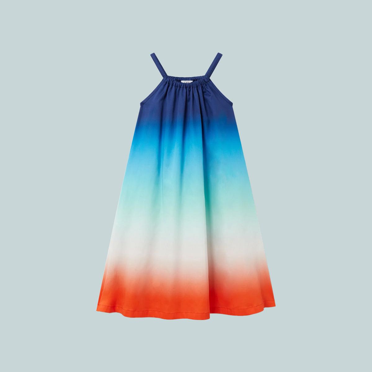 The Gradient summer dress is a sleeveless A-line kidswear design crafted from gradient-printed organic cotton fabric featuring the house's seasonal, vibrant gradient print of deep inky blues transitioning through shades of pink to vibrant orange, representing the summer’s shifting sky, sinking into the ocean’s horizon, alluding to nature’s ever-changing canvas. Completed with blue spaghetti straps.