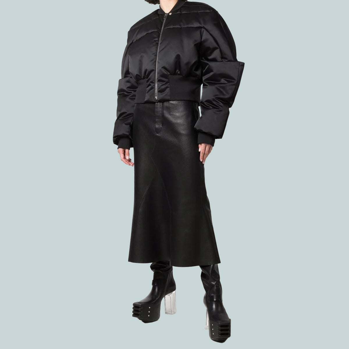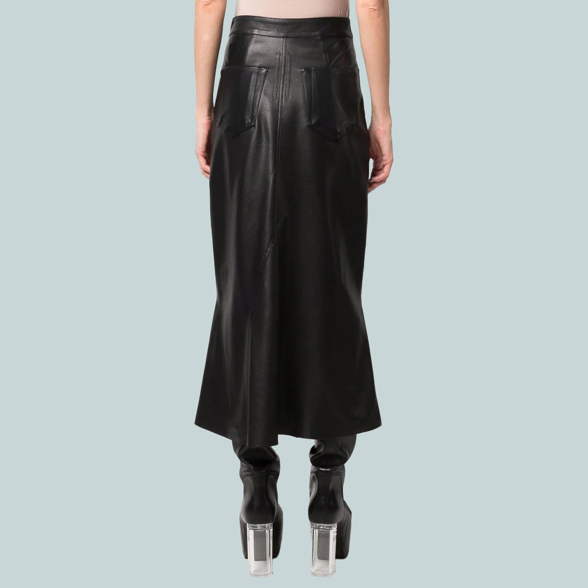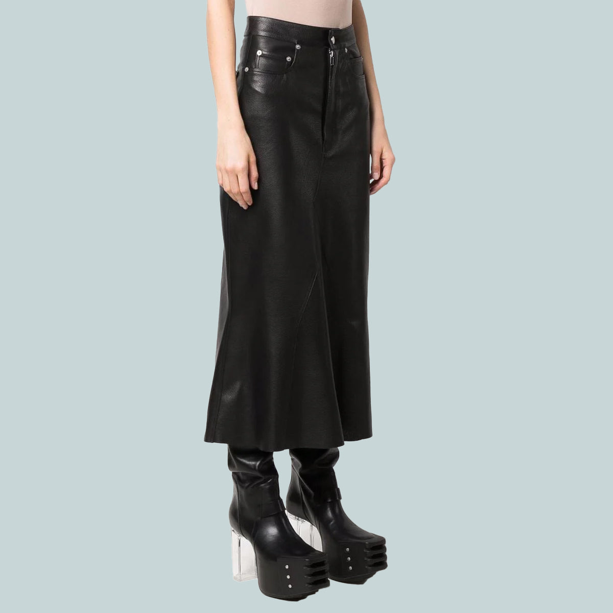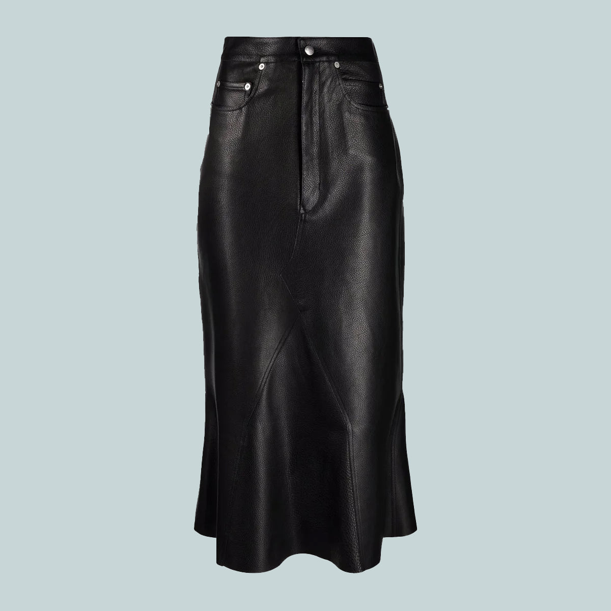 Rick Owens FW22 Strobe knee godet skirt in black soft grain cow leather.