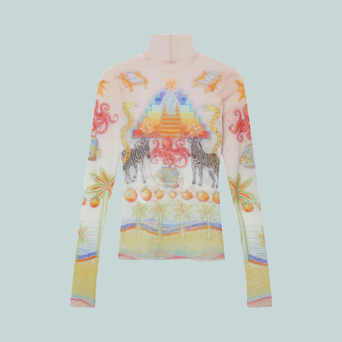 The L'Arbre De Vie mesh top is a long-sleeve printed sheer style featuring seasonal artwork inspired by the west coast of Mexico. Completed with a polo neck, long sleeves that extend over the wrist, and a Casablanca Paris branded label. Designed for a slim fit and can be styled with tailored trousers.