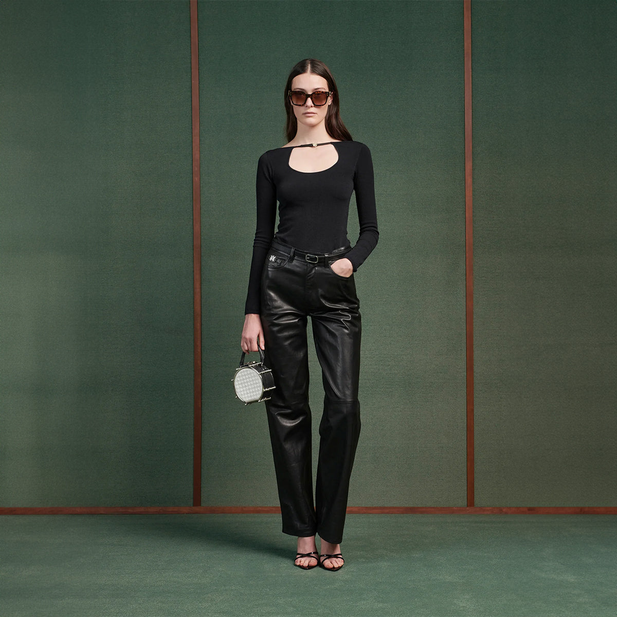 House signature forms are translated in seasonal fabrications for Spring-Summer 2025. The Leather Wide Straight Trouser is designed with classic five-pocket construction and MA icon hardware.