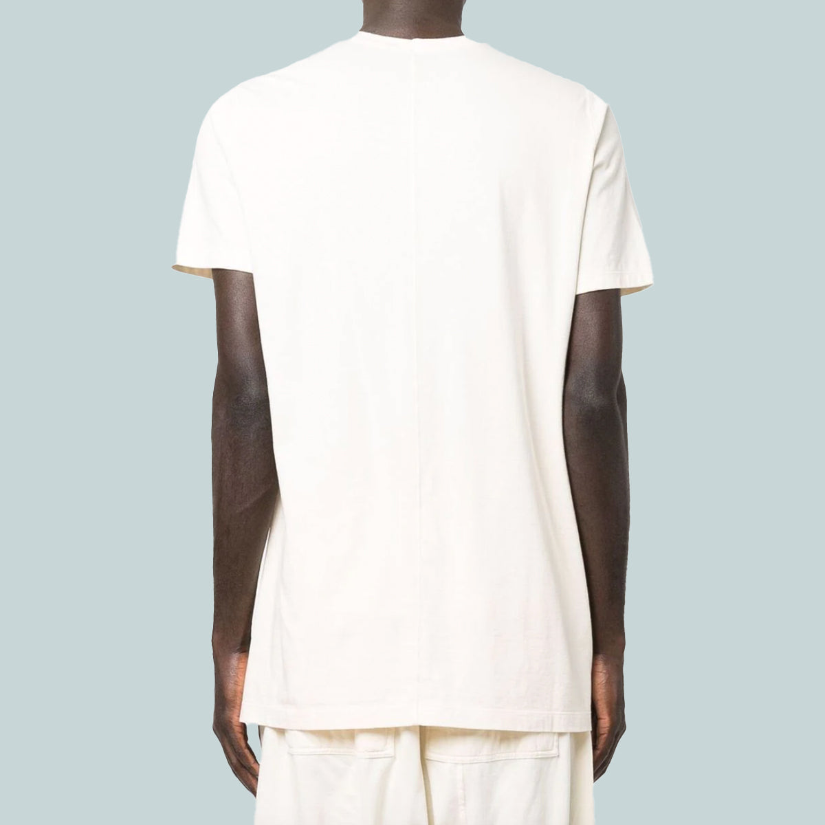 This level t is below hip length with short sleeves and a ribbed round crewneck. it features the signature level shoulder seams and single seam running down the centre back spine.