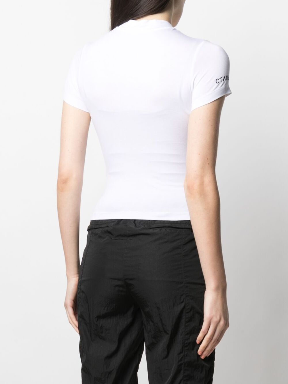 Short sleeve baby T-shirt in mid-weight stretch material. White with black brand slogan print. High mock neck. Cut for a figure hugging fit. Textile logo patch in orange at front hem.