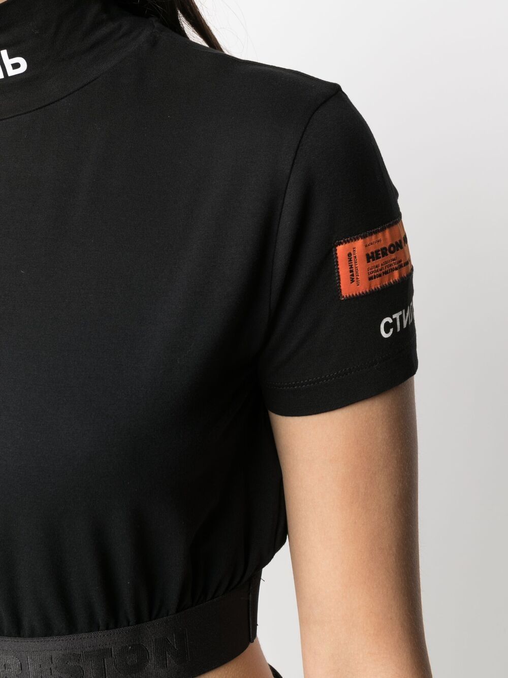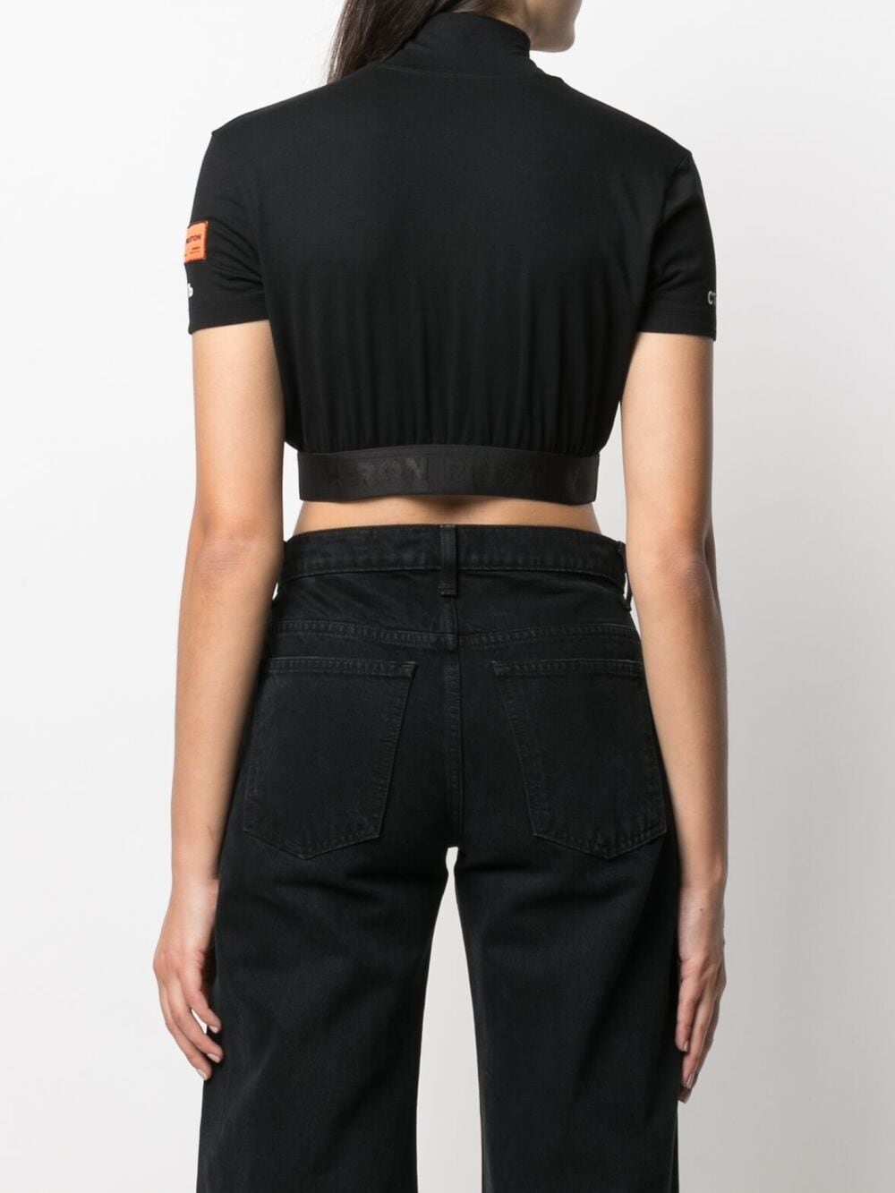 Short sleeve black T-shirt Viscose and elastane fabric. Logo printed on mock neck. Logo patch on sleeve. Elasticated cropped hem with branded band.