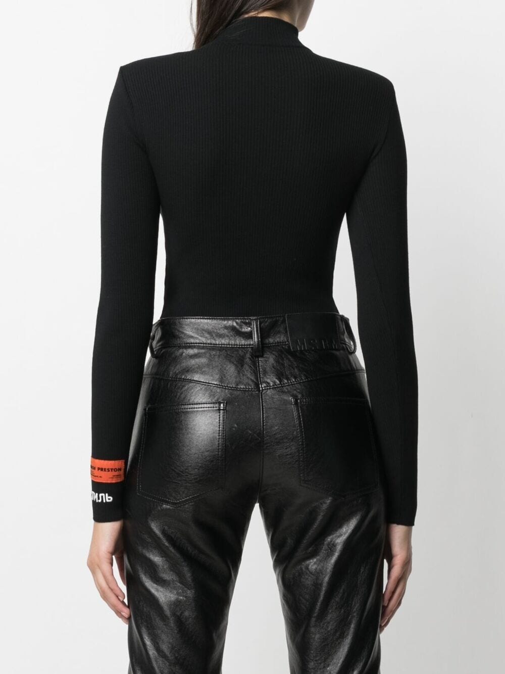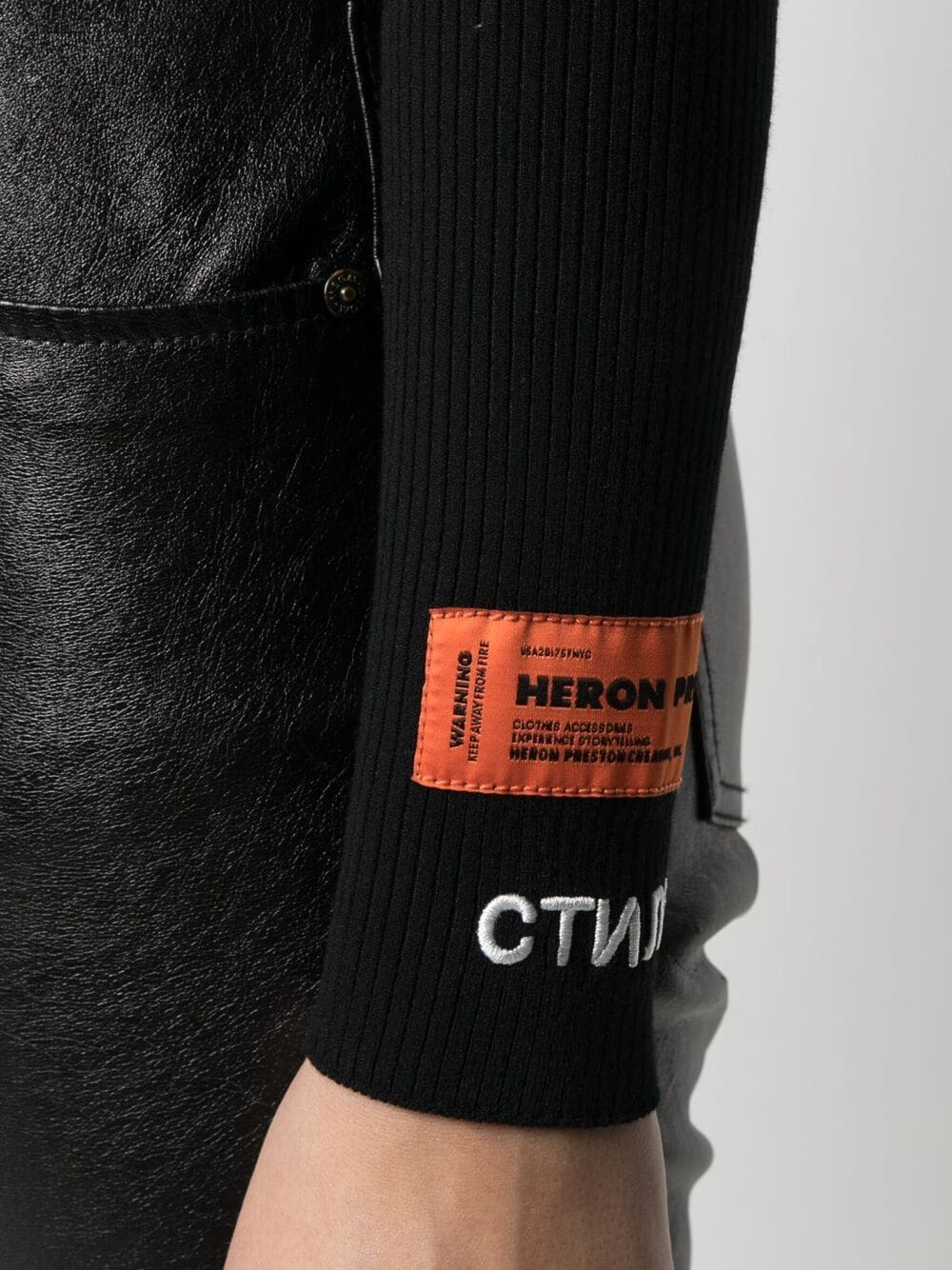 A wardrobe essential from Heron Preston. Long sleeve high neck bodysuit in fine rib material. Features the brands logo embroidered onto the funnel neck collar. Logo patch on back wrist. Stretch material with press-stud fastening.