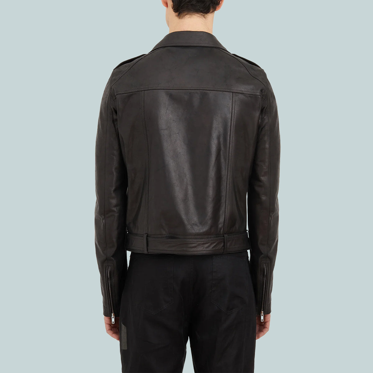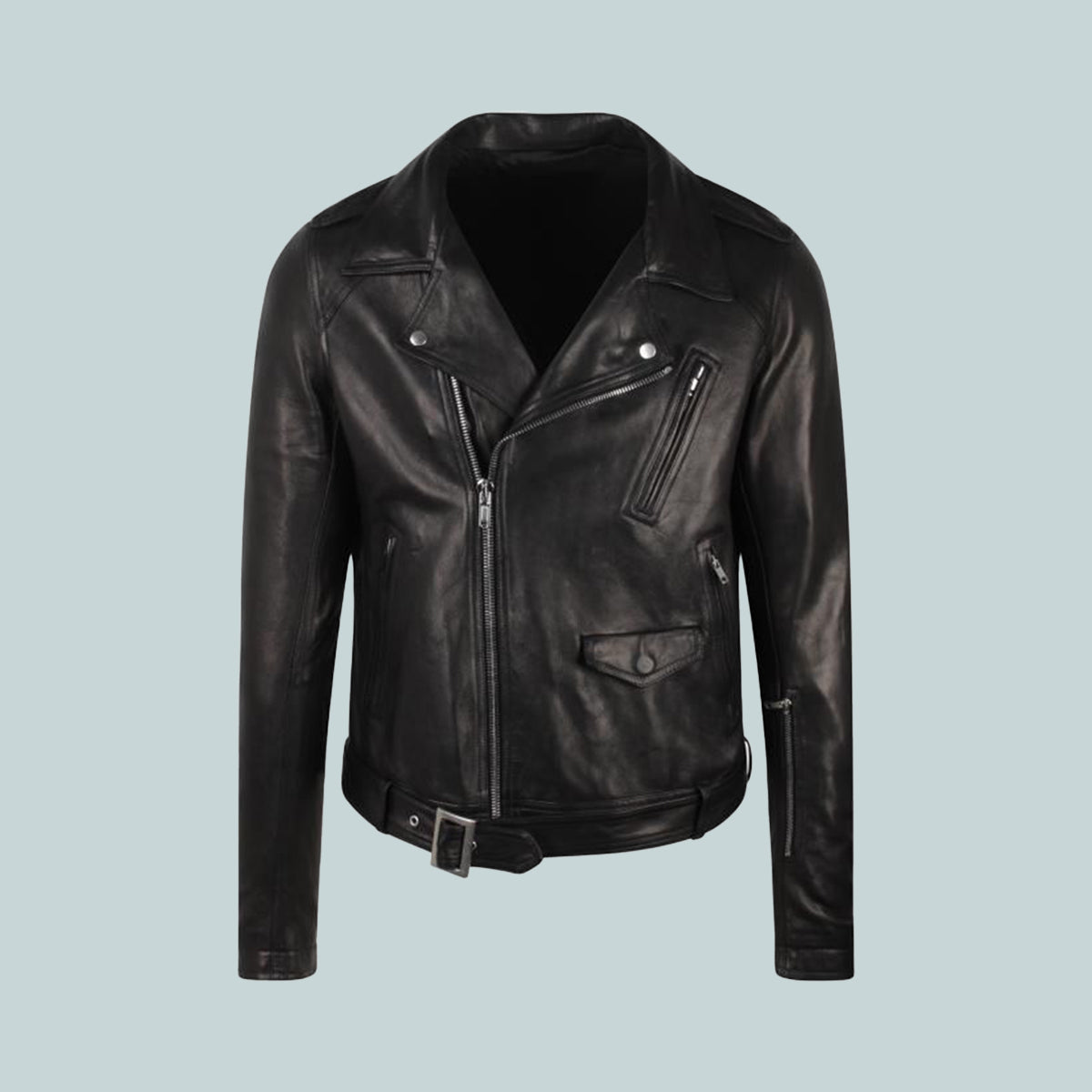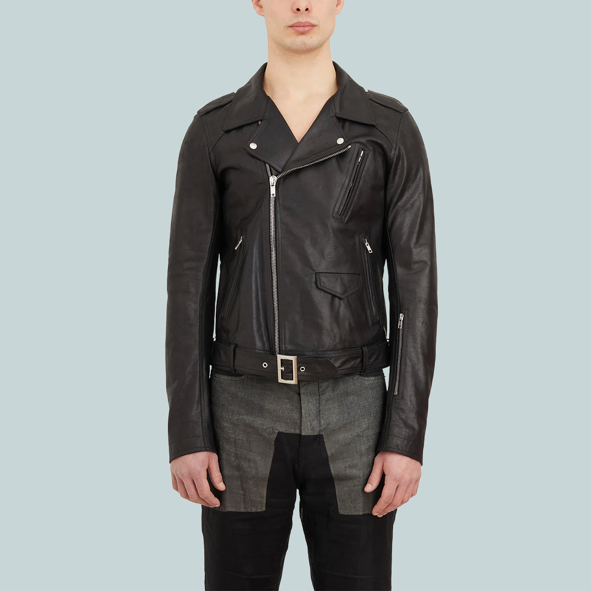 It features a biker double breasted front with off centre zipper, a wide collar and lapel with silver ykk snaps. It also has a zipper pocket on the left forearm, a double jet pocket with zippers on the chest, two on the side body and one flap pocket with inner snap on the lower body. It has zipper openings at wrists, shoulder epaulettes with snap details, and a belt attached at the rear of the waistband with a solid brass palladium, plated buckle.