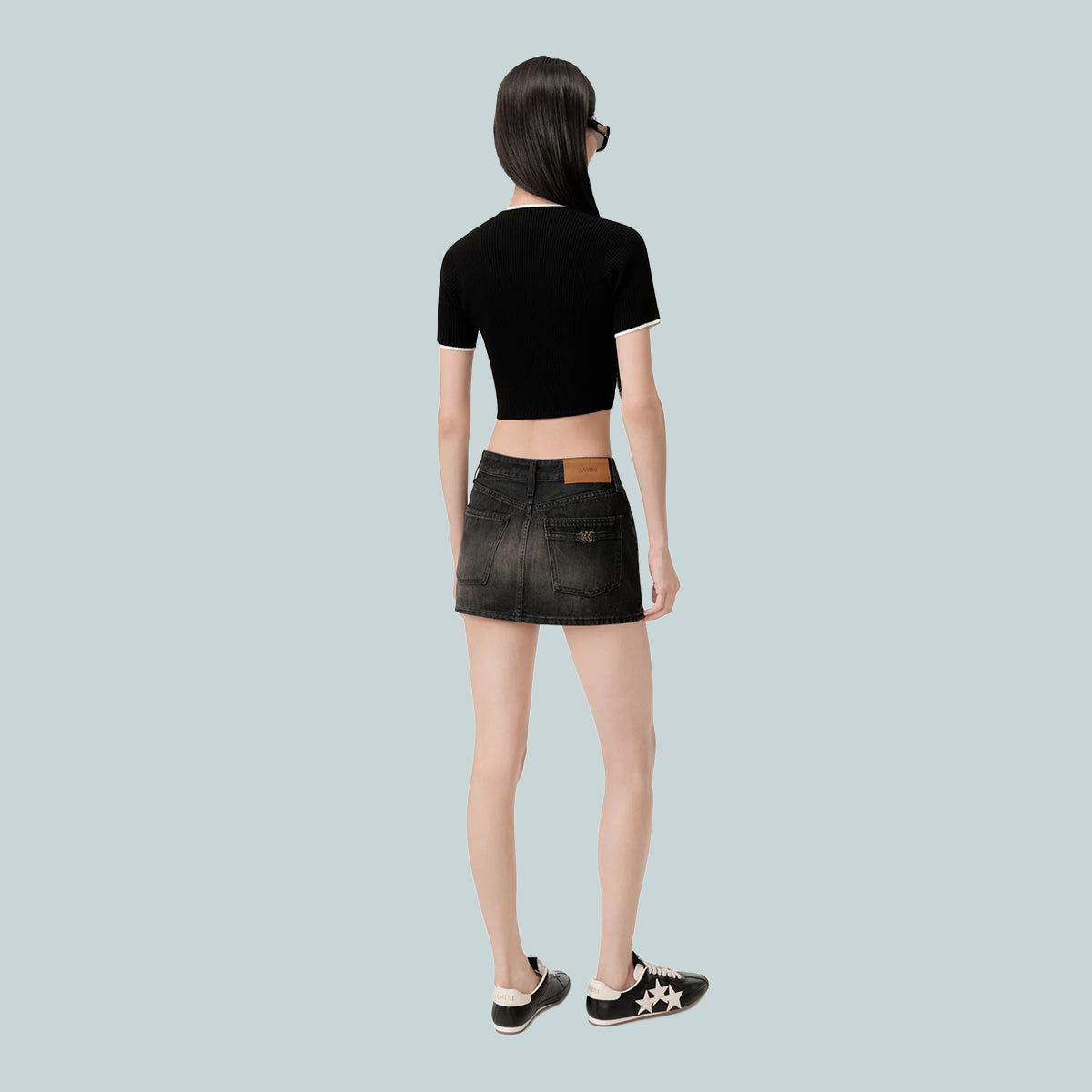 Womenswear introduces versatile silhouettes enhanced by house iconography. The MA Baby Tee is designed in rib knit with an embroidered MA icon and contrast finishes at collar and cuffs.