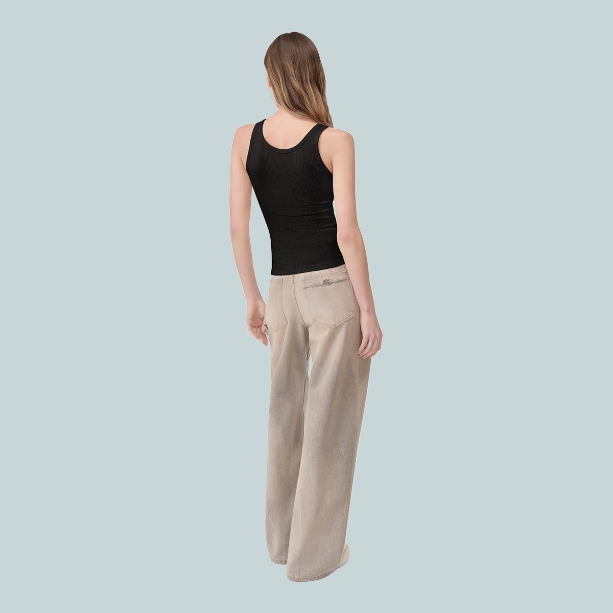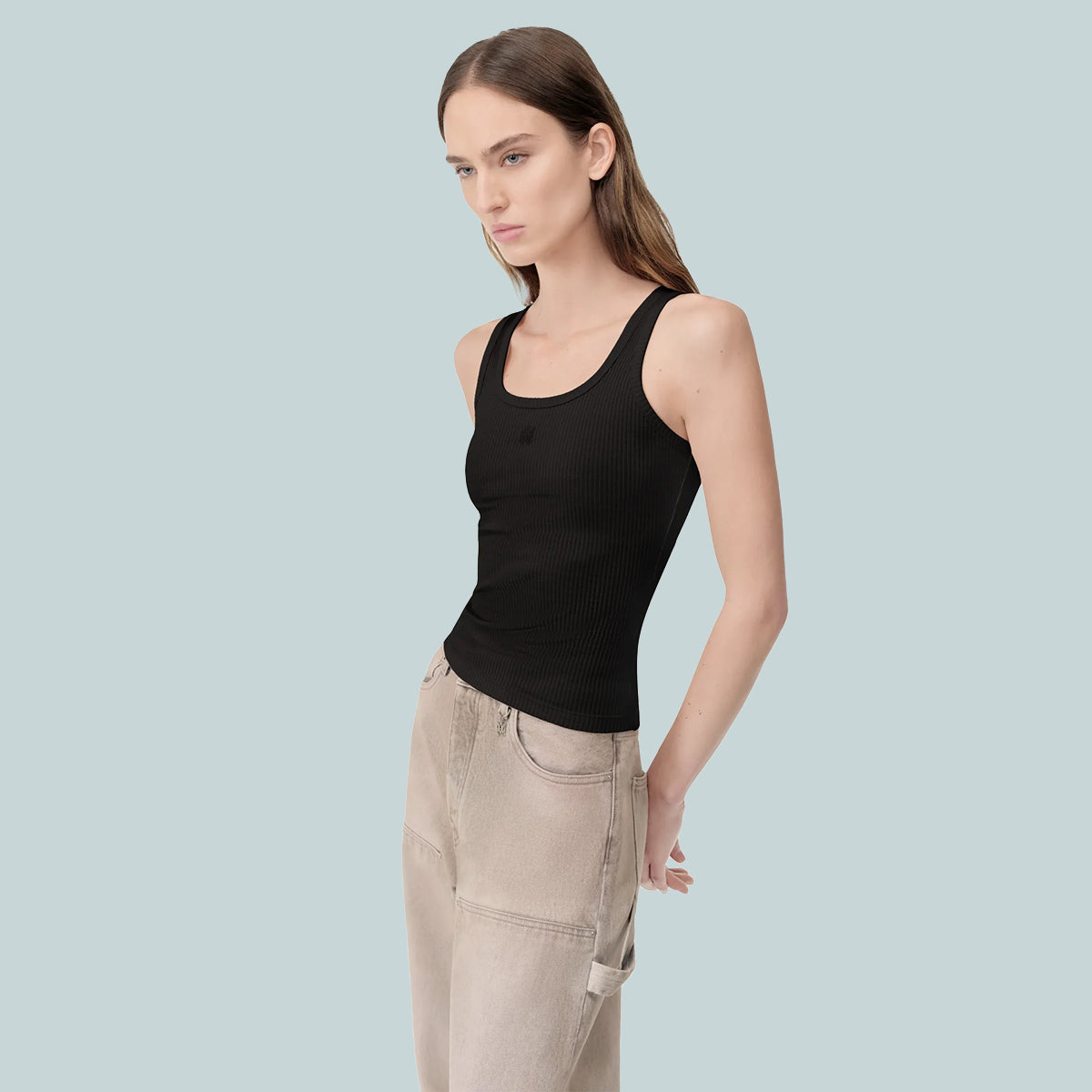 Pre-fall 2025 womenswear introduces versatile silhouettes enhanced by house iconography. The MA embroidery tank is designed in stretch cotton rib with rib accents and the embroidered ma icon.