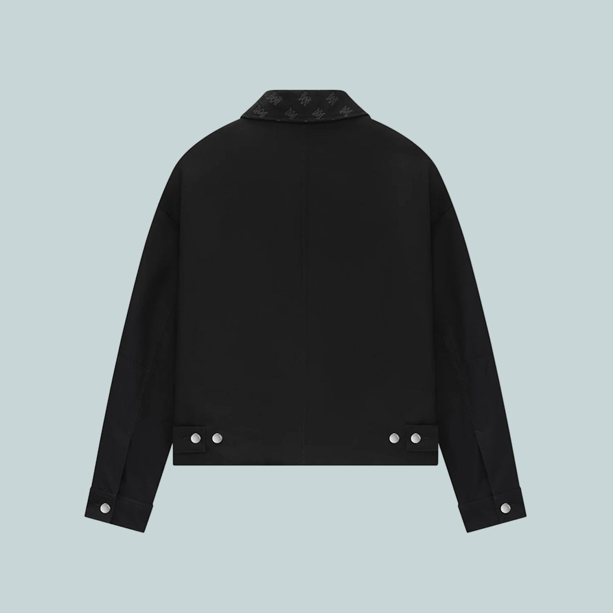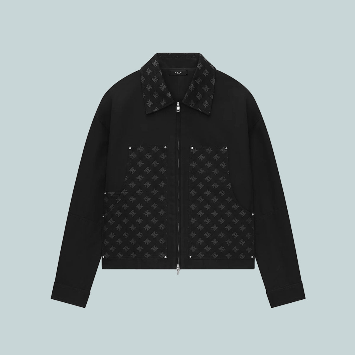 For Spring-Summer 2025, MA Quad monogram print takes on new meaning in time-honored utilitarian silhouettes. The MA Quad Jacquard Work Jacket features front patch panels in custom-woven MA Quad cotton wool, side tabs, button cuffs, and double-zip closure.