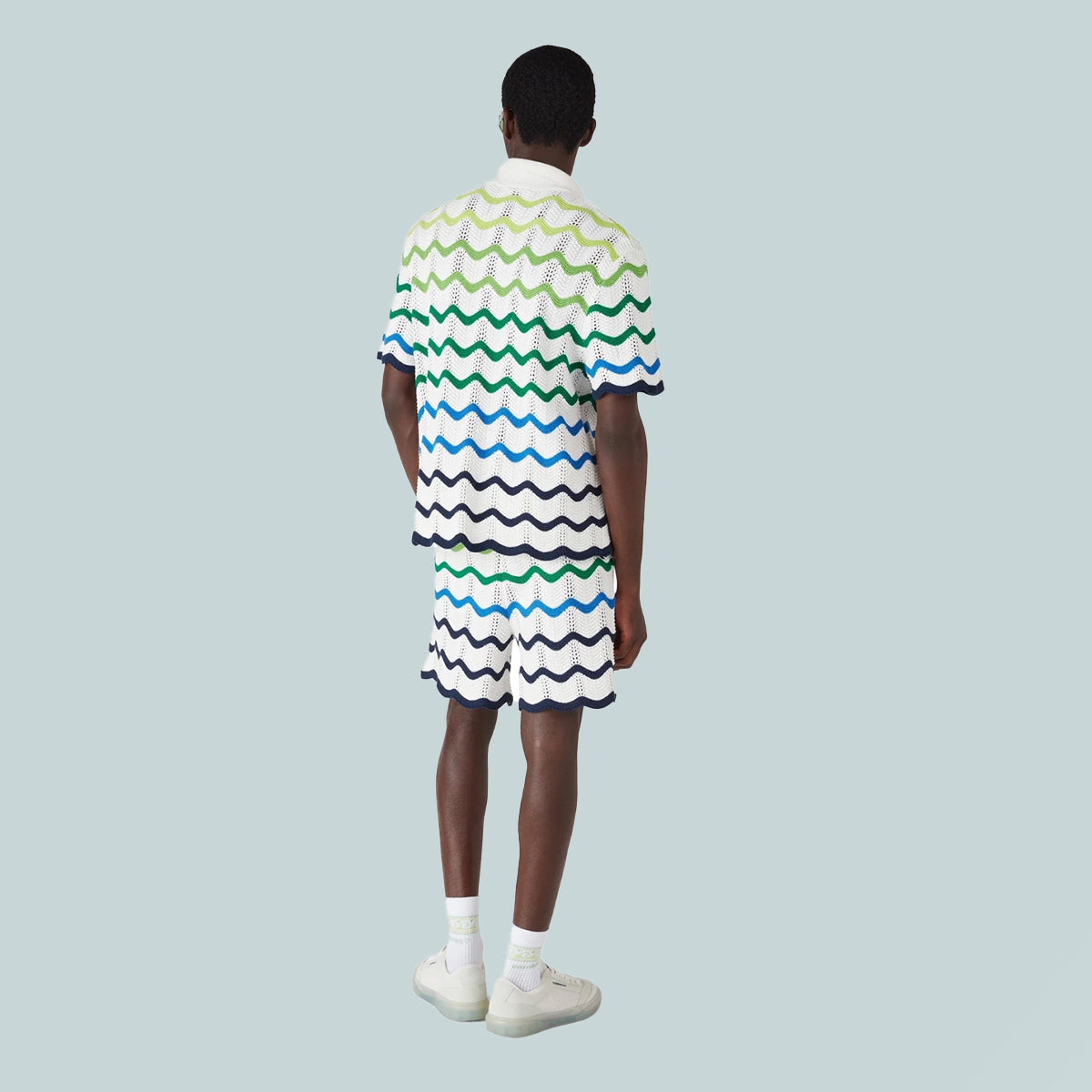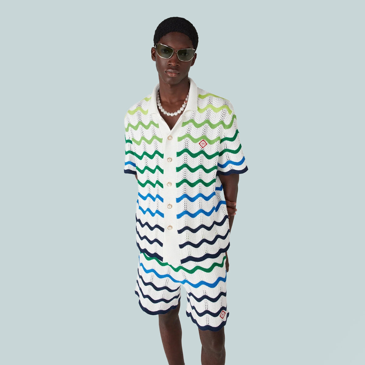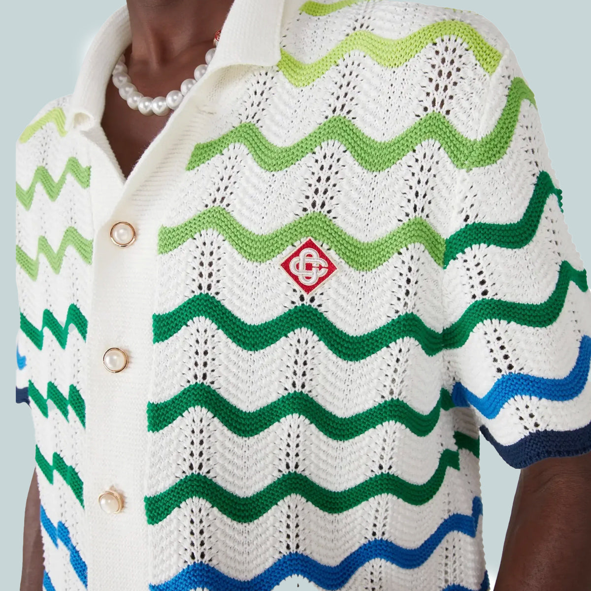 The Wave knit shirt is a refined design crafted from an open weave crochet cotton fabric featuring the season's knitted gradient. Completed with a button closure, a Cuban-style collared silhouette with short sleeves, ribbed trim detailing, and the house's signature gold rim pearl buttons and diamond logo.