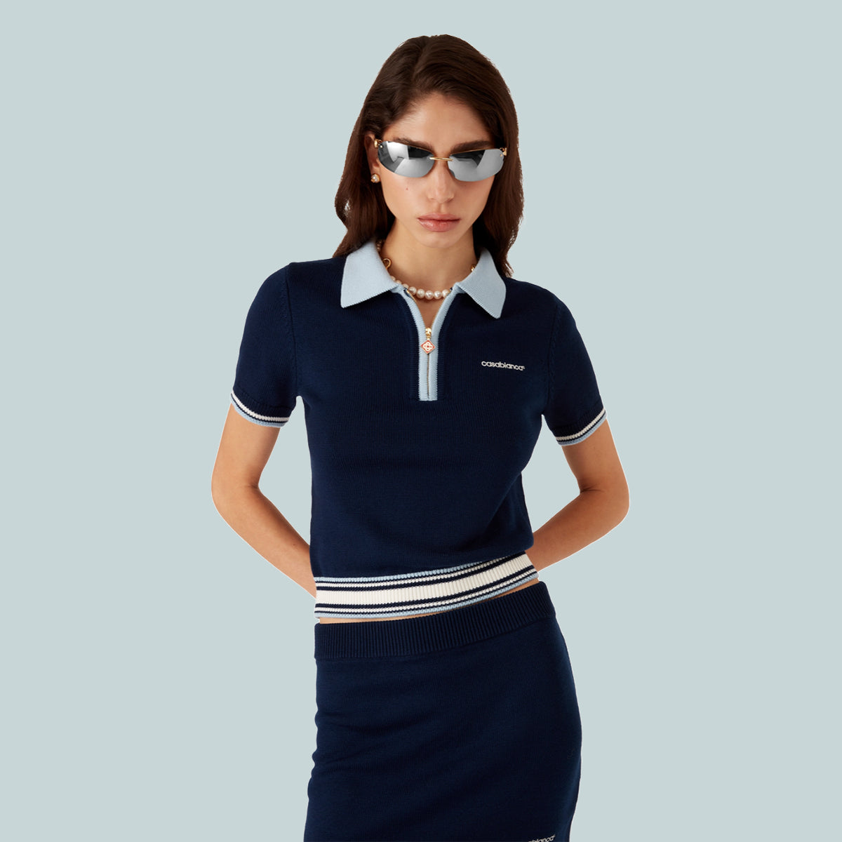 The merino knit tennis polo shirt is a short-sleeve design crafted from merino wool fabric. Completed with a zip closure, signature diamond logo zipper tab, stripe hem and cuffs details, a contrast rib collar and placket, and the house's Casablanca logo.