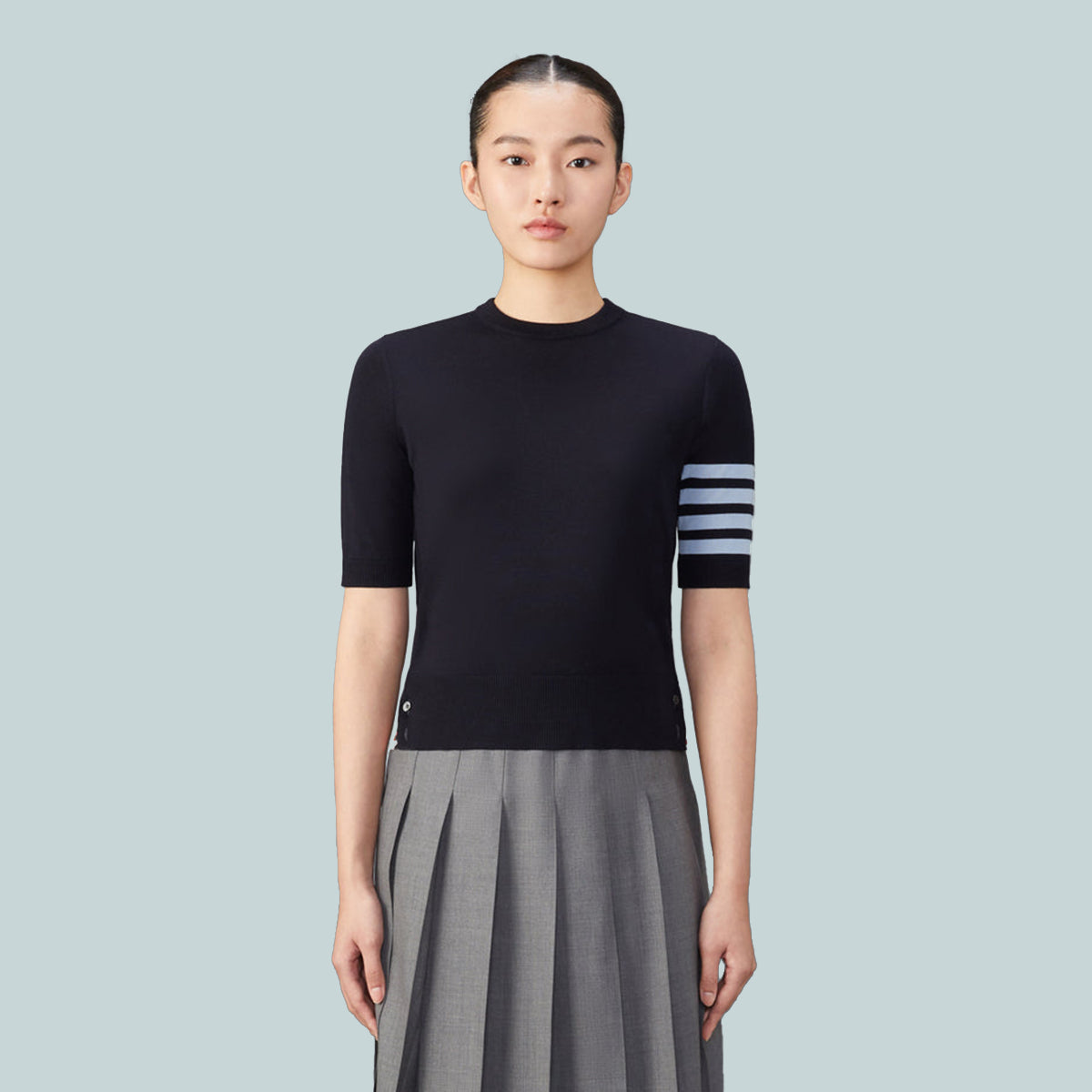 Enduring through the ages, the silhouette of this timeless tee has weathered the test of time. Adorned with Thom Browne's signature emblems throughout, this classic jersey stitch garment is meticulously tailored to perfection.
