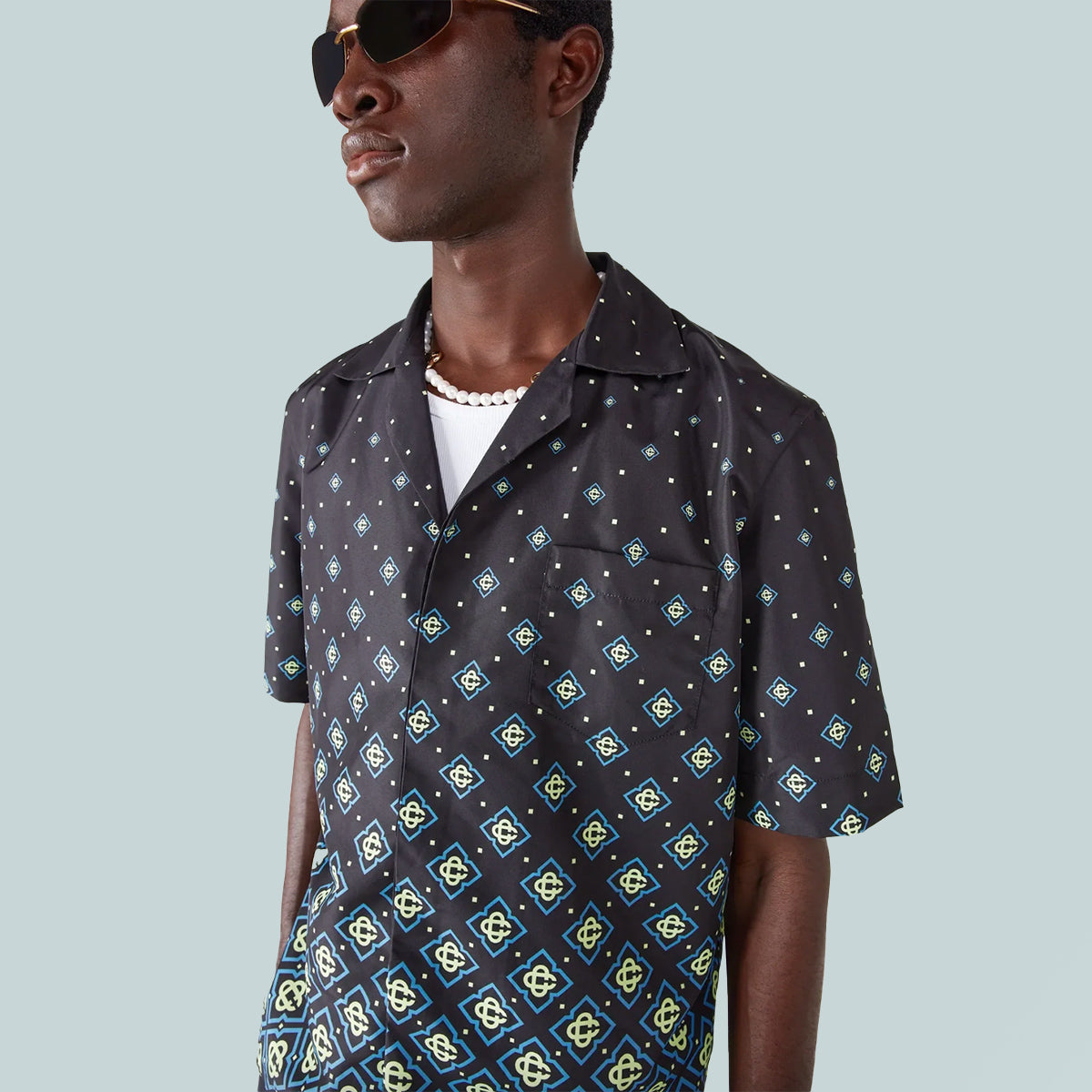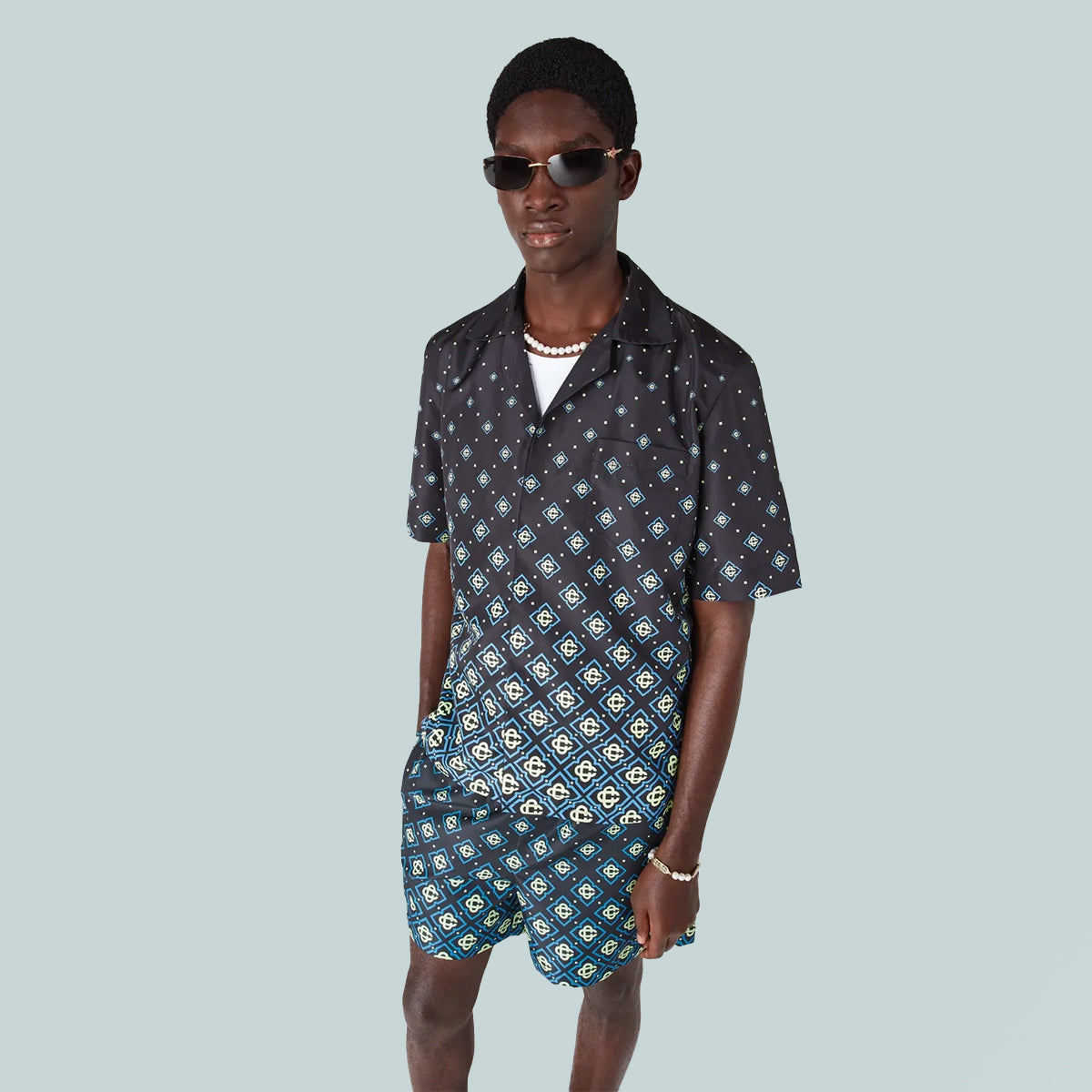 The Degrade Black Monogram swim shirt is a refined technical design featuring the house's monogram pattern. Completed with technical swim fabric construction, short sleeves, button closure, interlocking CC logo corozo buttons and sophisticated detailing that captures the brand's elevated approach to swimwear.