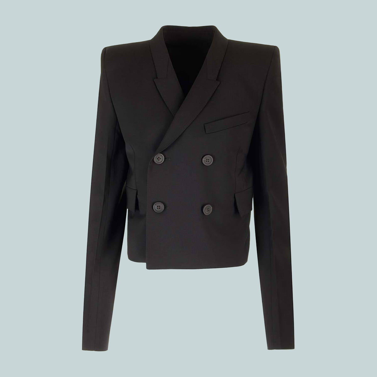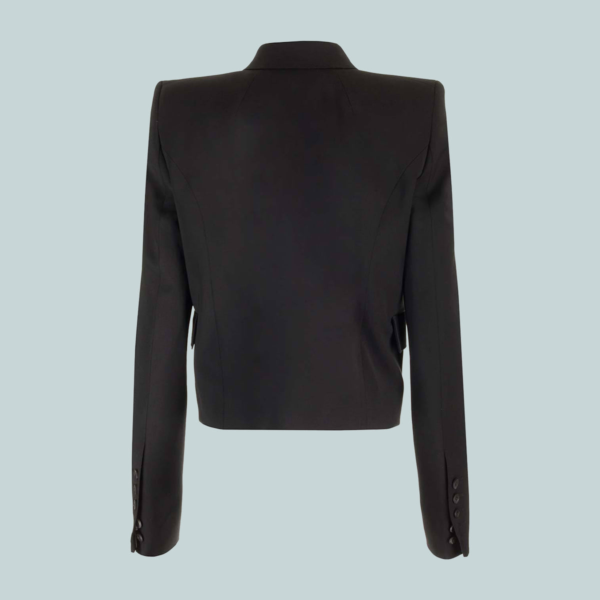 This jmf neue alice jacket has a cropped below waist length and a close fit. it has long slim sleeves and features exaggerated klaus shoulders, a slim lapel, a double breasted front with four buttons. it has a welt breast pocket, side pockets with flaps and five button cuffs.