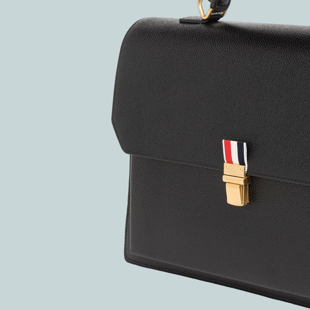 School bag in black pebble grain leather with removable striped webbing wide shoulder strap. Flap top with brass clasp. Leather top handle, leather backpack straps. Bisected interior with zip compartment and front pocket. Striped lining. Gold foil printed at interior front pocket. Brass hardware. Signature striped grosgrain loop tab at interior.