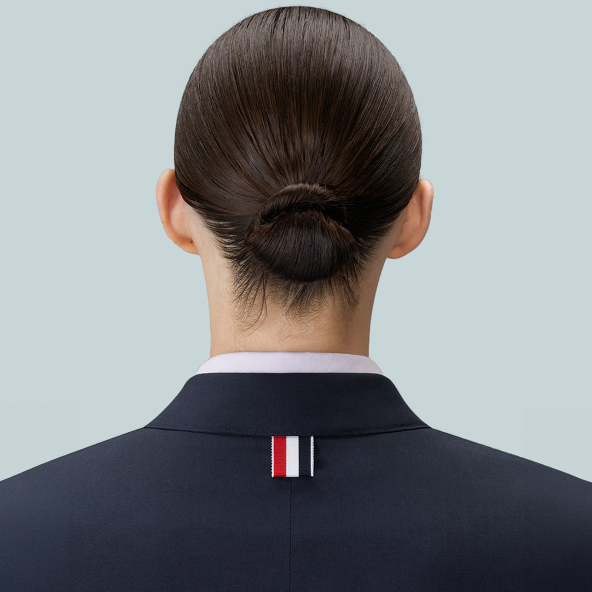 Signature striped grosgrain loop tab at back of neck