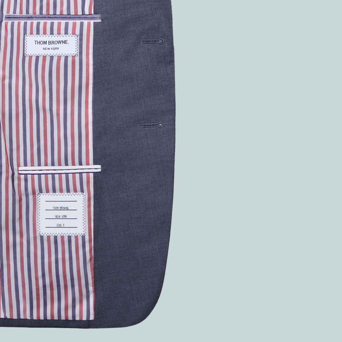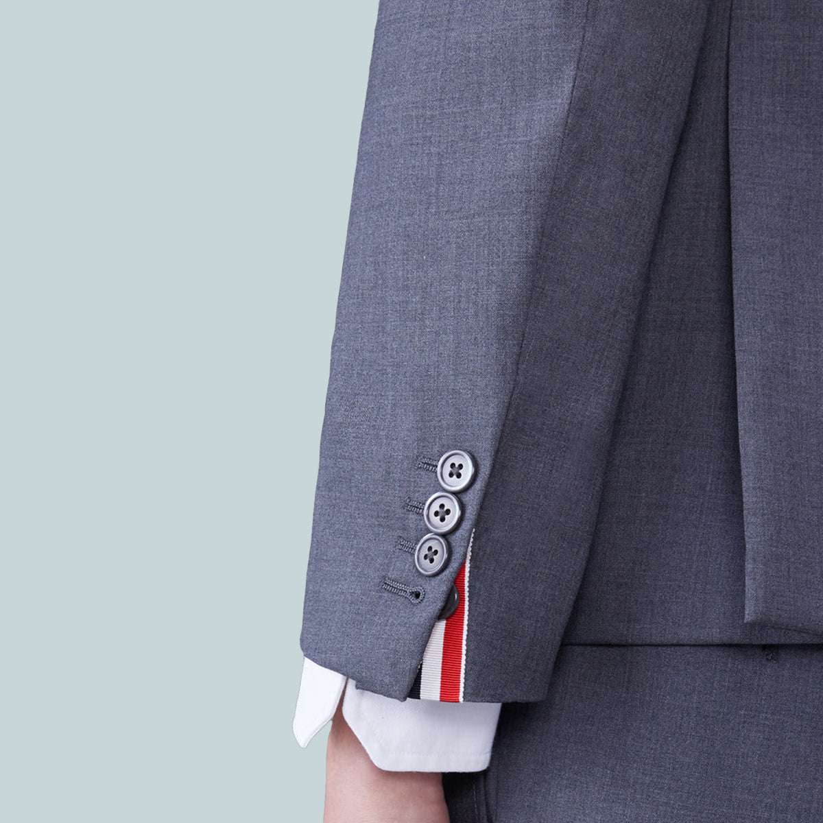Classic sport coat in grey plain weave suiting with tonal 4-bar stripe detail at left sleeve. 2-button front closure, notched lapels, 2 flap front pockets, single chest pocket. Buttoned cuffs with signature striped grosgrain trim. Double vented back hem. Striped lining with interior pockets and name tag. Signature striped grosgrain loop tab at back of neck. Classic - Fit 1.