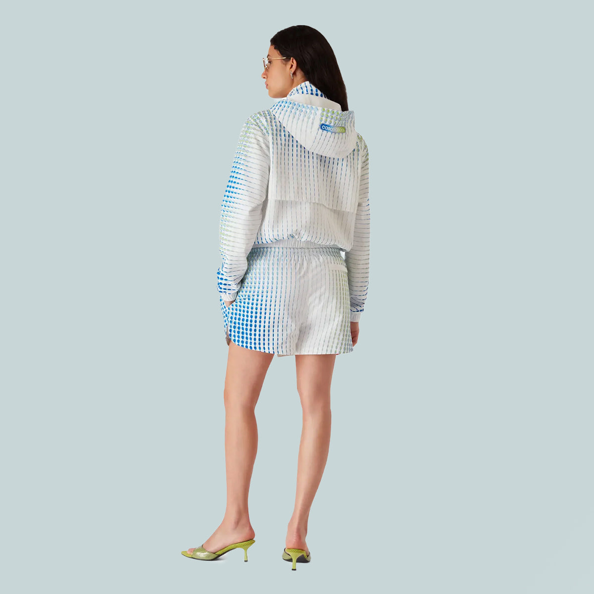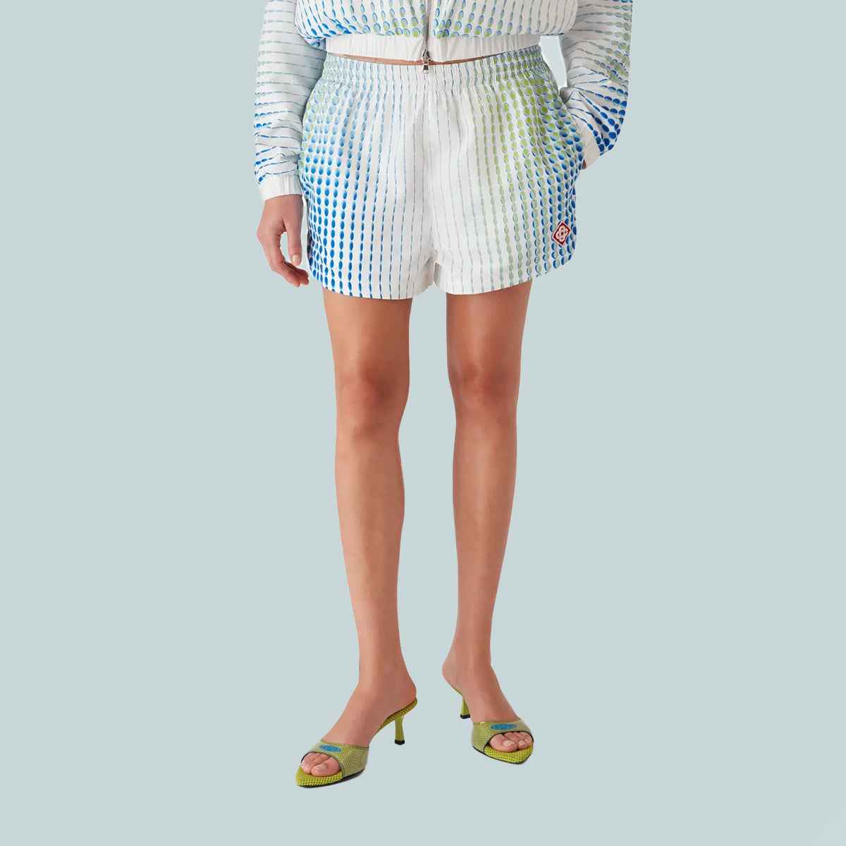 The printed poly taffeta shorts are a classic design featuring the house's signature diamond logo patch and unique artwork created in collaboration with Martin Naumann, known for his work with gradients and texture effects. Completed with an elasticised waistband, drawstring fastening, a lining, side pockets, and curved hem detail.