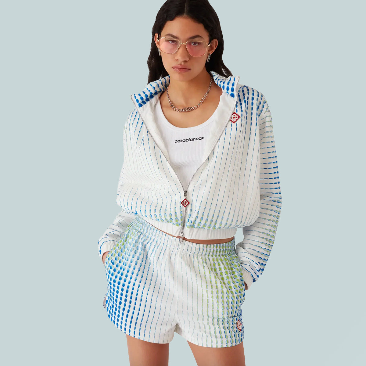 The Dots windbreaker jacket is a sportswear design crafted from a technical taffeta fabric with the house's signature artistry, featuring gradient motifs and texture effects. Completed with a long sleeve, a hood with drawstring fastening, elasticised cuffs and hem, a zip closure featuring the house's signature diamond zipper tab, and the house's diamond logo.