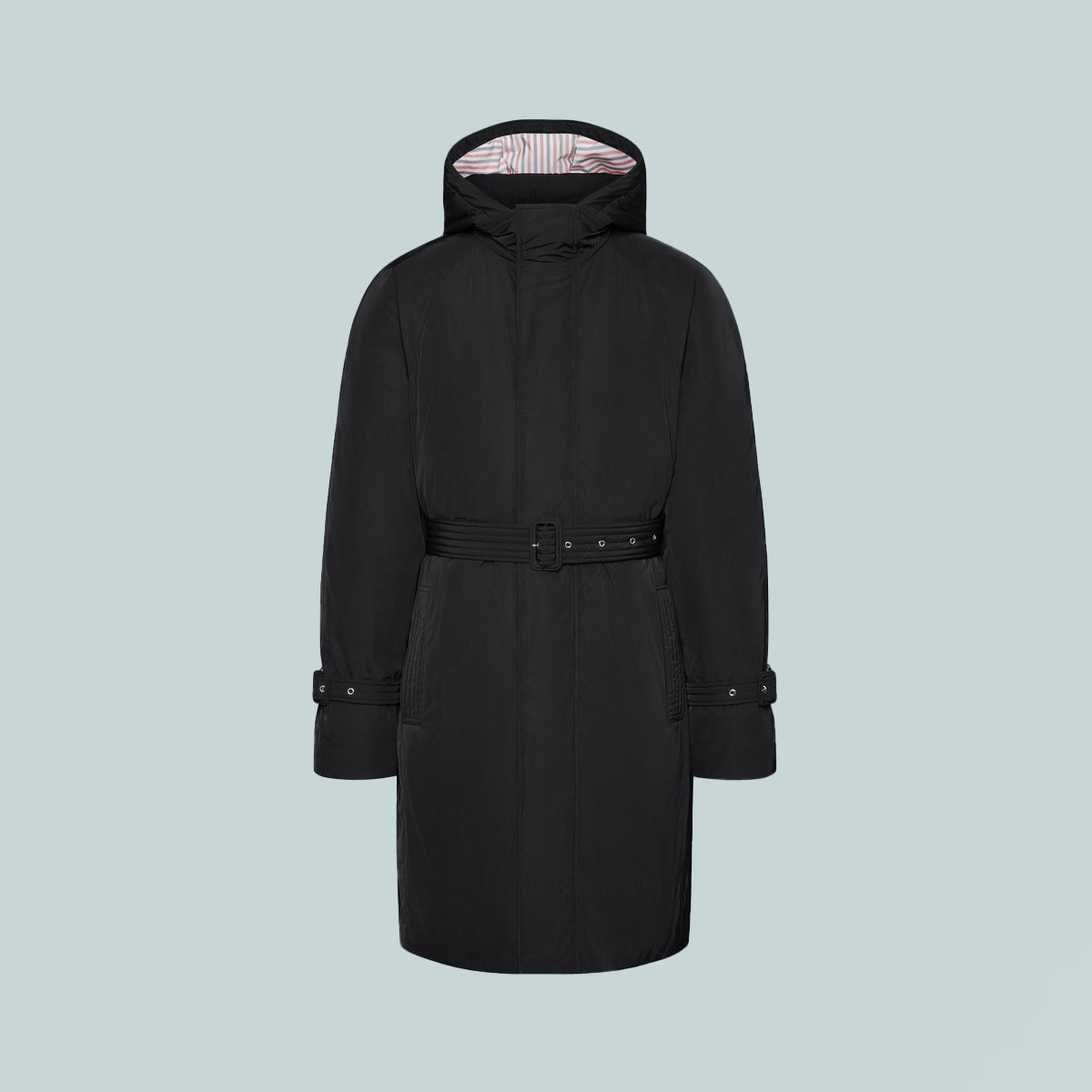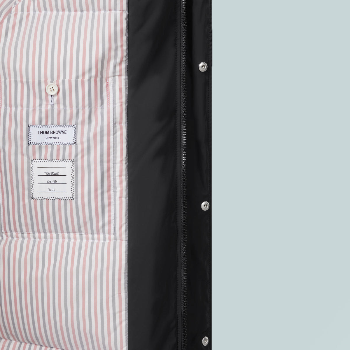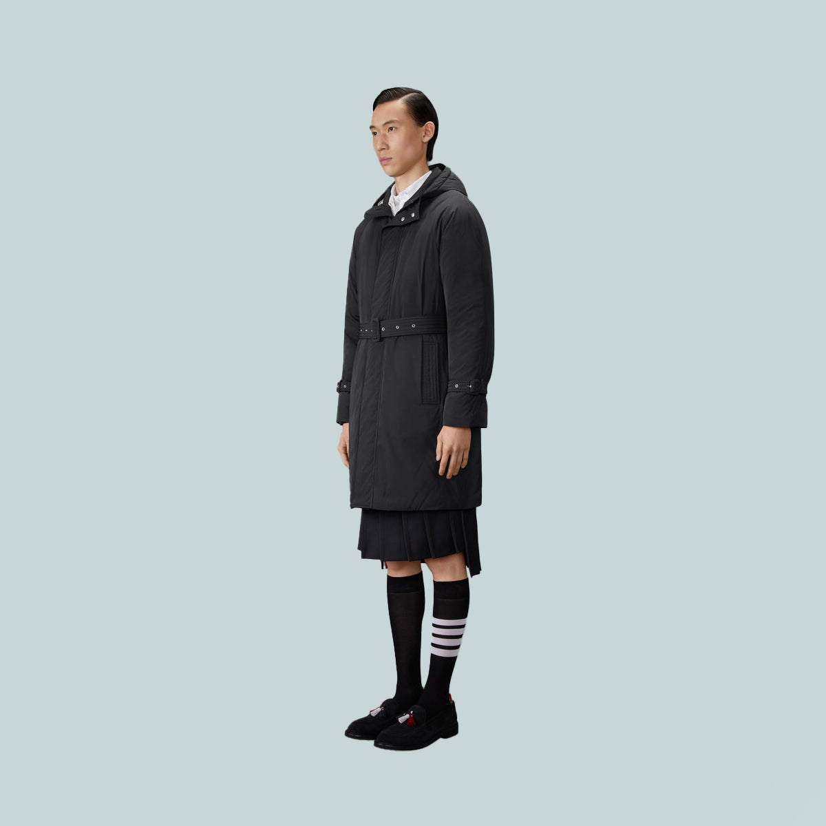 Winter weather calls for the comfort of this signature Thom Browne parka, filled with luxe down and finished with a flattering belted waist and adjustable belted cuffs. Inspired by a trip to Utah, Thom envisioned an elongated silhouette to shield more of the body from unforgiving conditions. Built to last and crafted with Thom's signature attention to detail and quality.