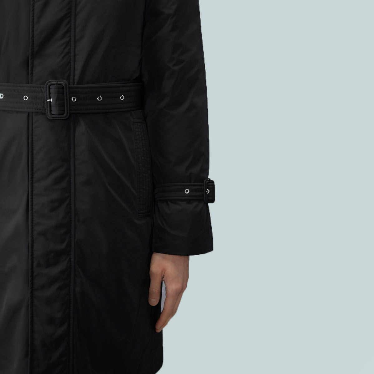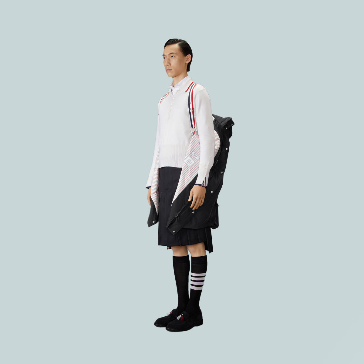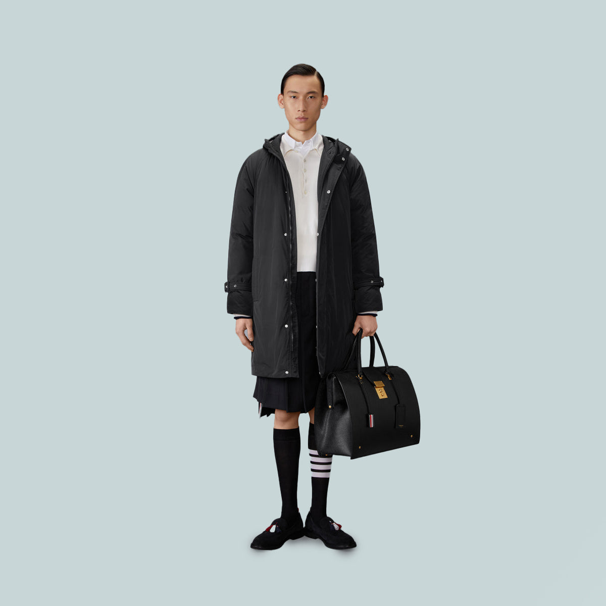 Winter weather calls for the comfort of this signature Thom Browne parka, filled with luxe down and finished with a flattering belted waist and adjustable belted cuffs. Inspired by a trip to Utah, Thom envisioned an elongated silhouette to shield more of the body from unforgiving conditions. Built to last and crafted with Thom's signature attention to detail and quality.