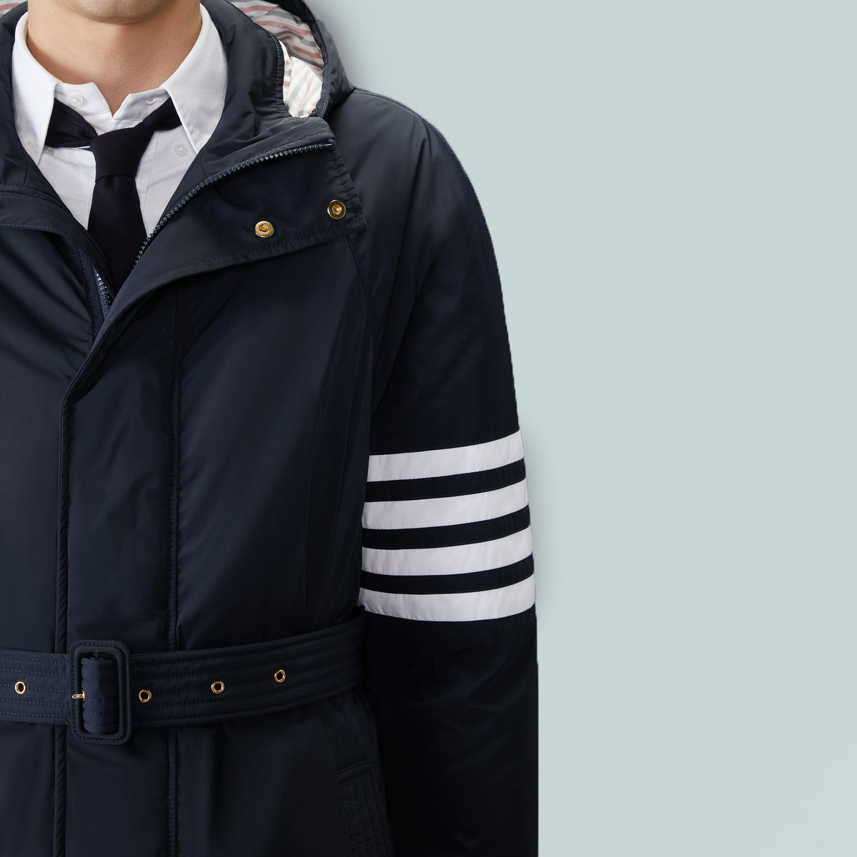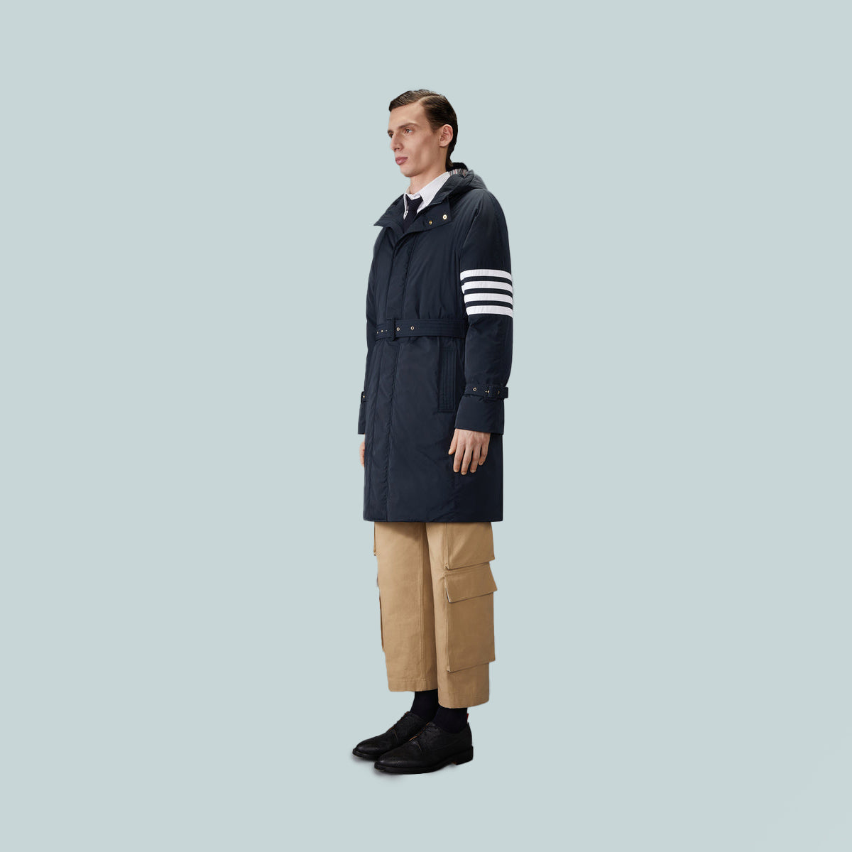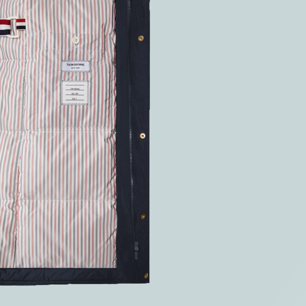 Winter weather calls for the comfort of this signature Thom Browne parka, filled with luxe down and finished with a flattering belted waist and adjustable belted cuffs. Inspired by a trip to Utah, Thom envisioned an elongated silhouette to shield more of the body from unforgiving conditions. Built to last and crafted with Thom's signature attention to detail and quality.