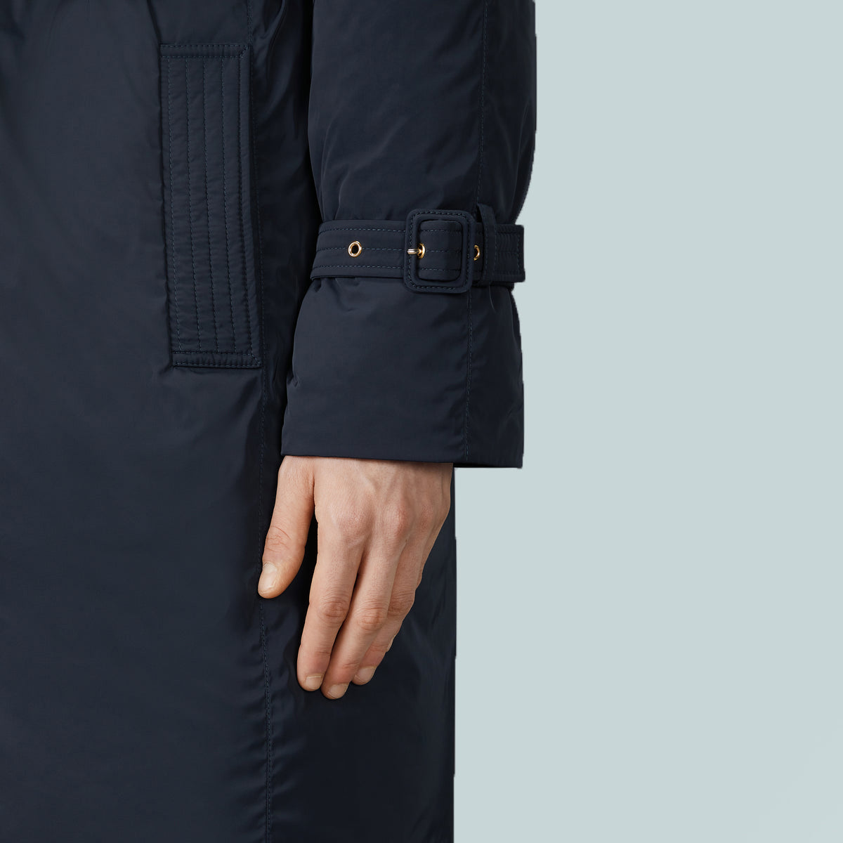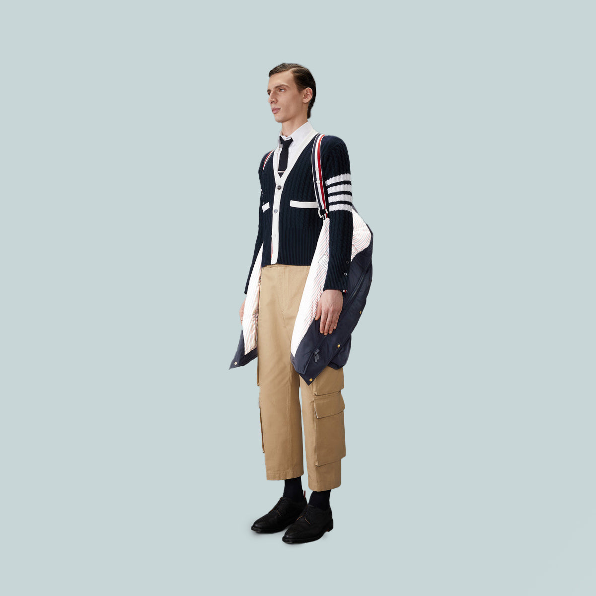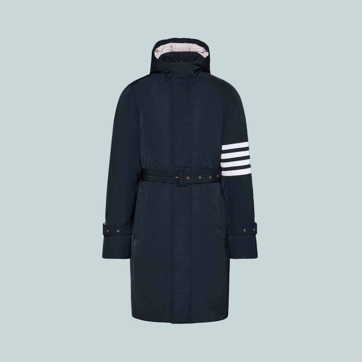 Winter weather calls for the comfort of this signature Thom Browne parka, filled with luxe down and finished with a flattering belted waist and adjustable belted cuffs. Inspired by a trip to Utah, Thom envisioned an elongated silhouette to shield more of the body from unforgiving conditions. Built to last and crafted with Thom's signature attention to detail and quality.