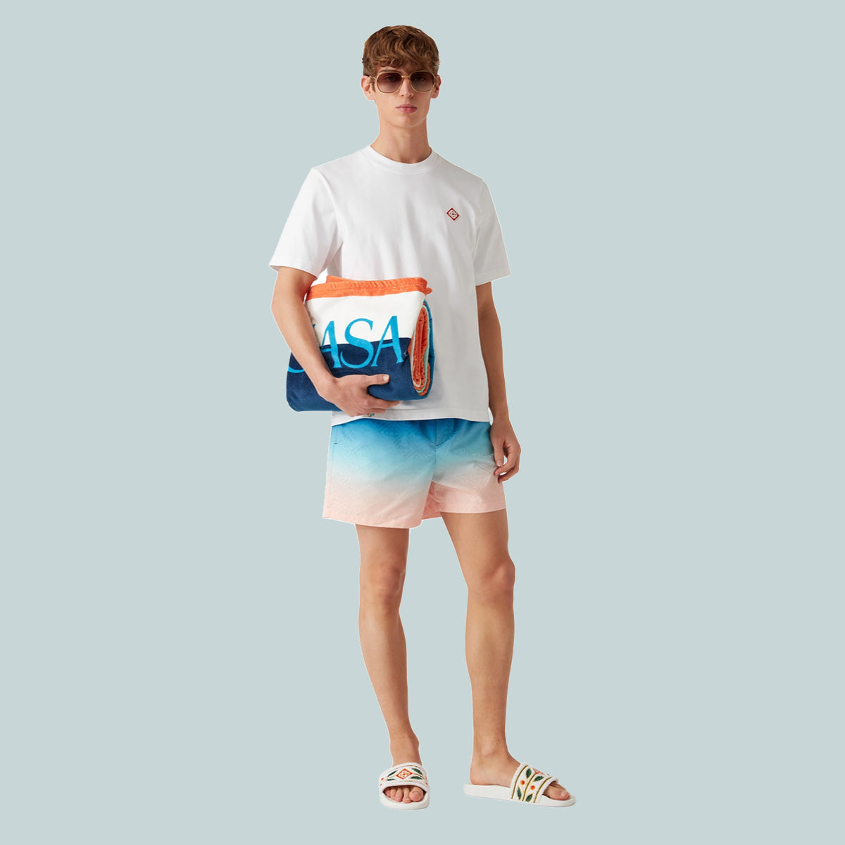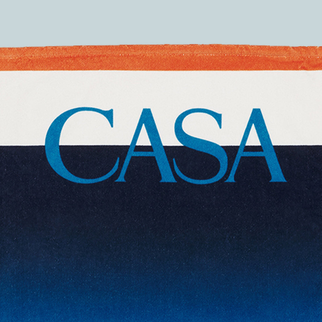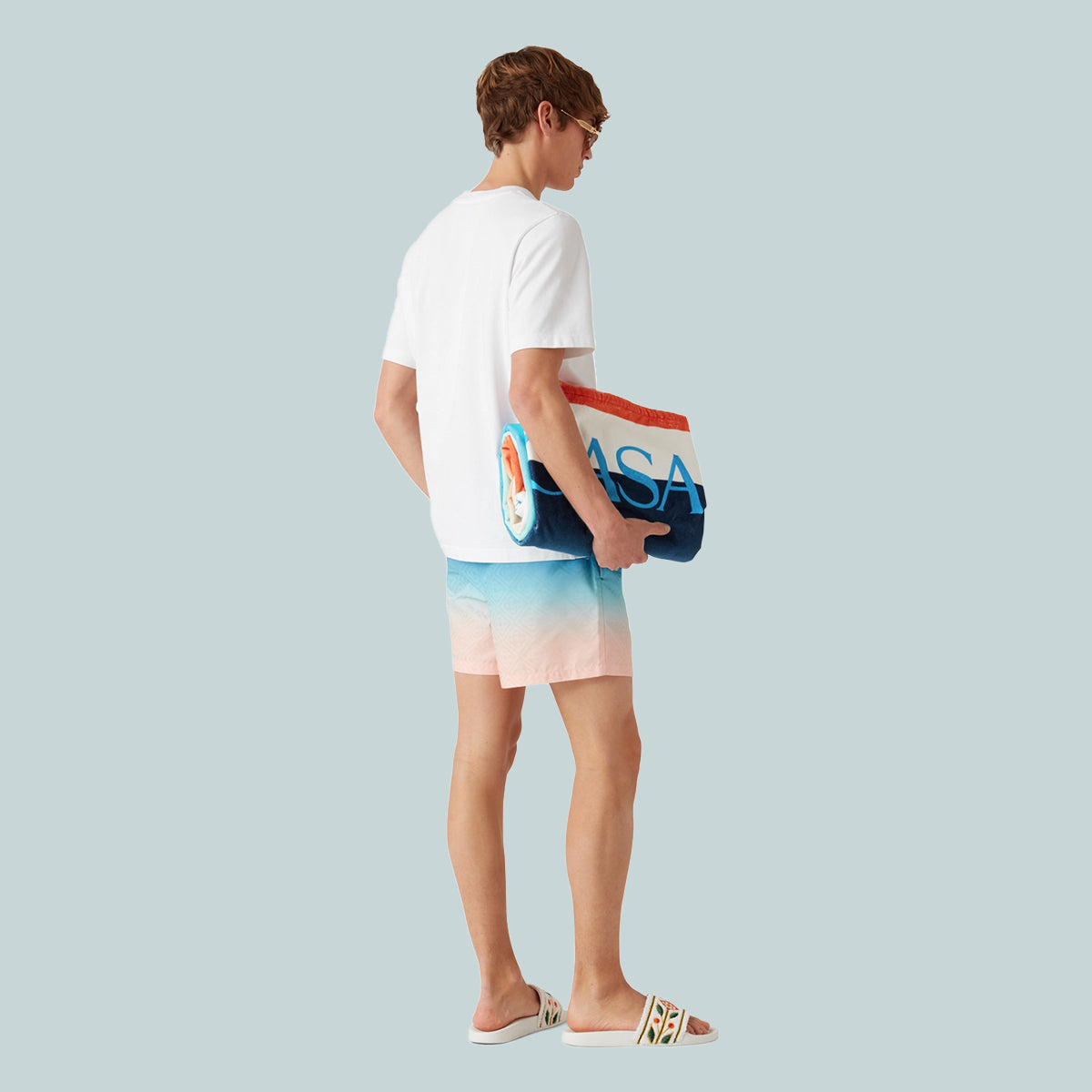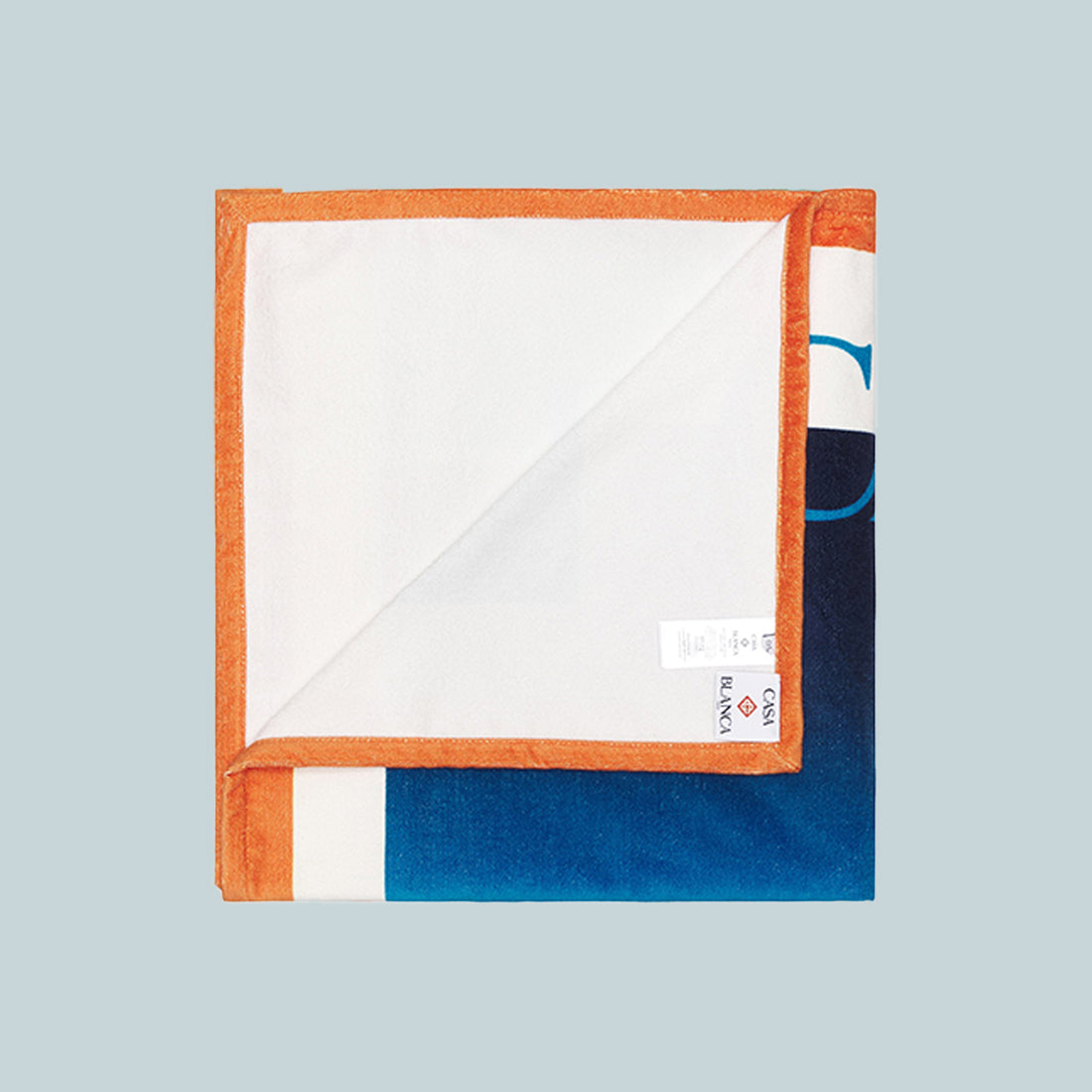 The gradient beach towel is a printed design crafted from a cotton towelling fabric. Completed with the house's stacked logo and a light blue border.