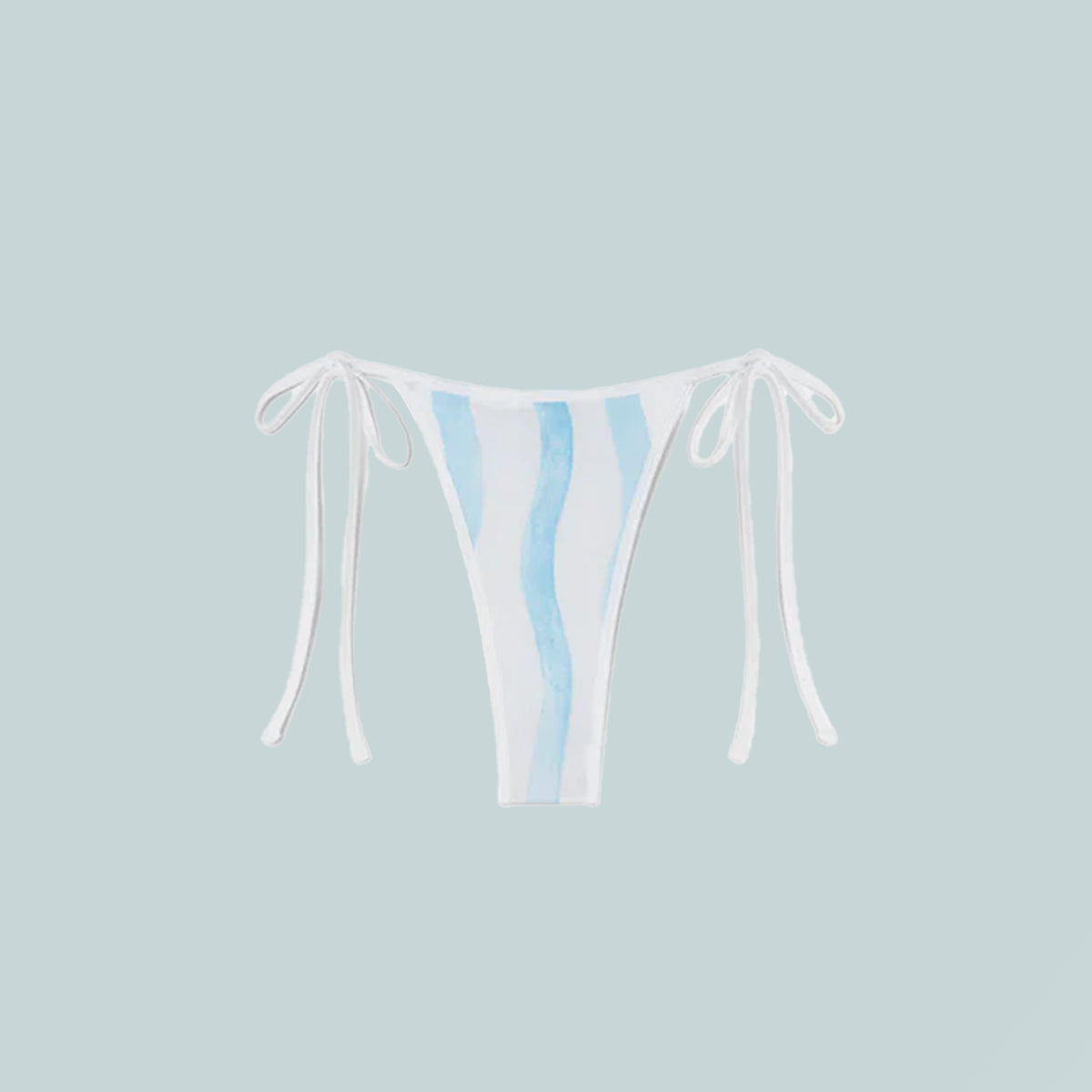 The Wave bikini bottom is a blue and white wavy stripe design that fastens at the hip with white strings. Crafted from a poly-blend fabric, this piece features white trimmings and is intended to be worn with its coordinating bikini top.