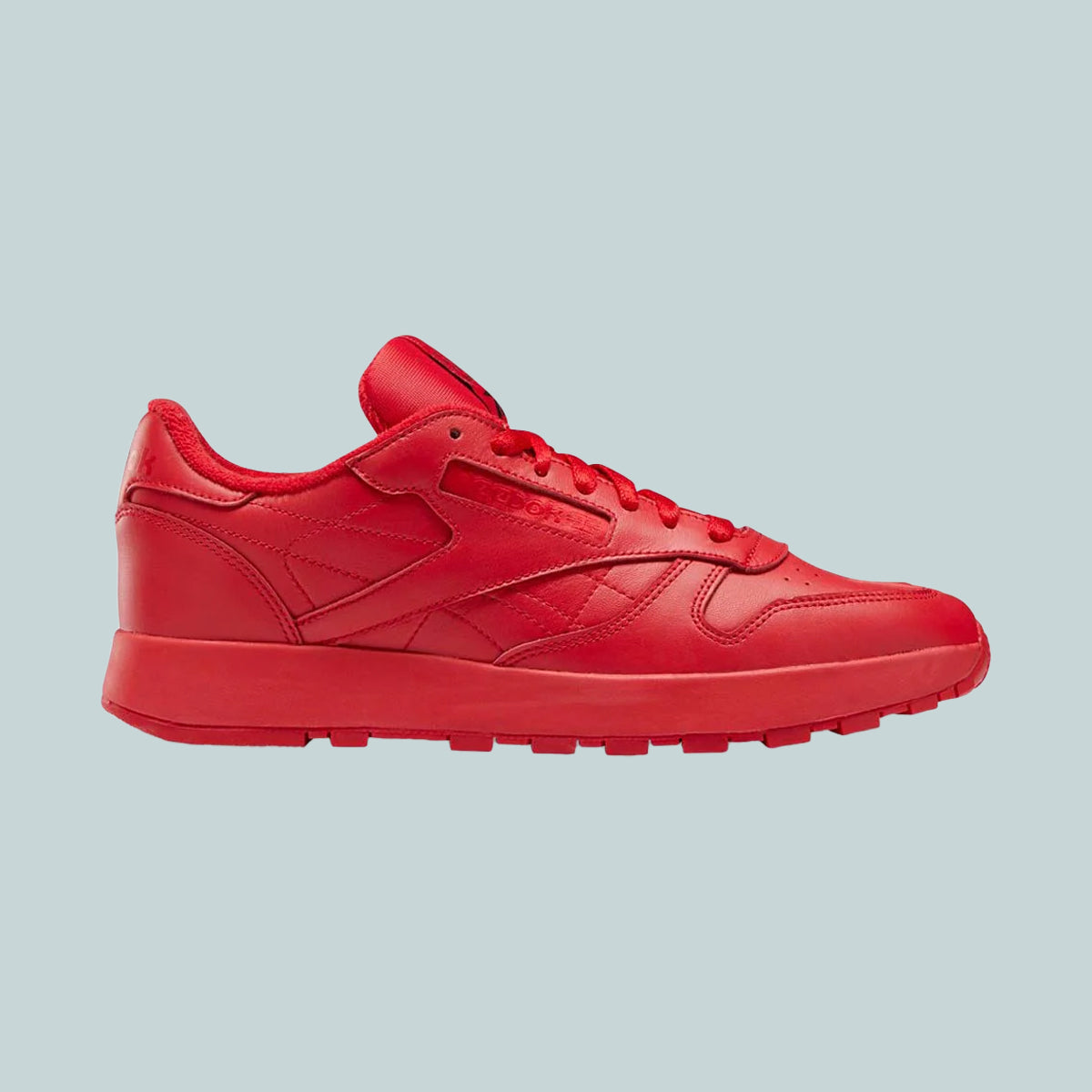 Maison Margiela's signature Tabi toe in collaboration with Reebok's Classic Leather sneakers. A low-top paneled buffed nappa leather sneaker with matching Tabi socks. Lace up closure. Textile logo patch at padded lounge. Logo patch at outer side. Flat rubber sole. Textile lining.