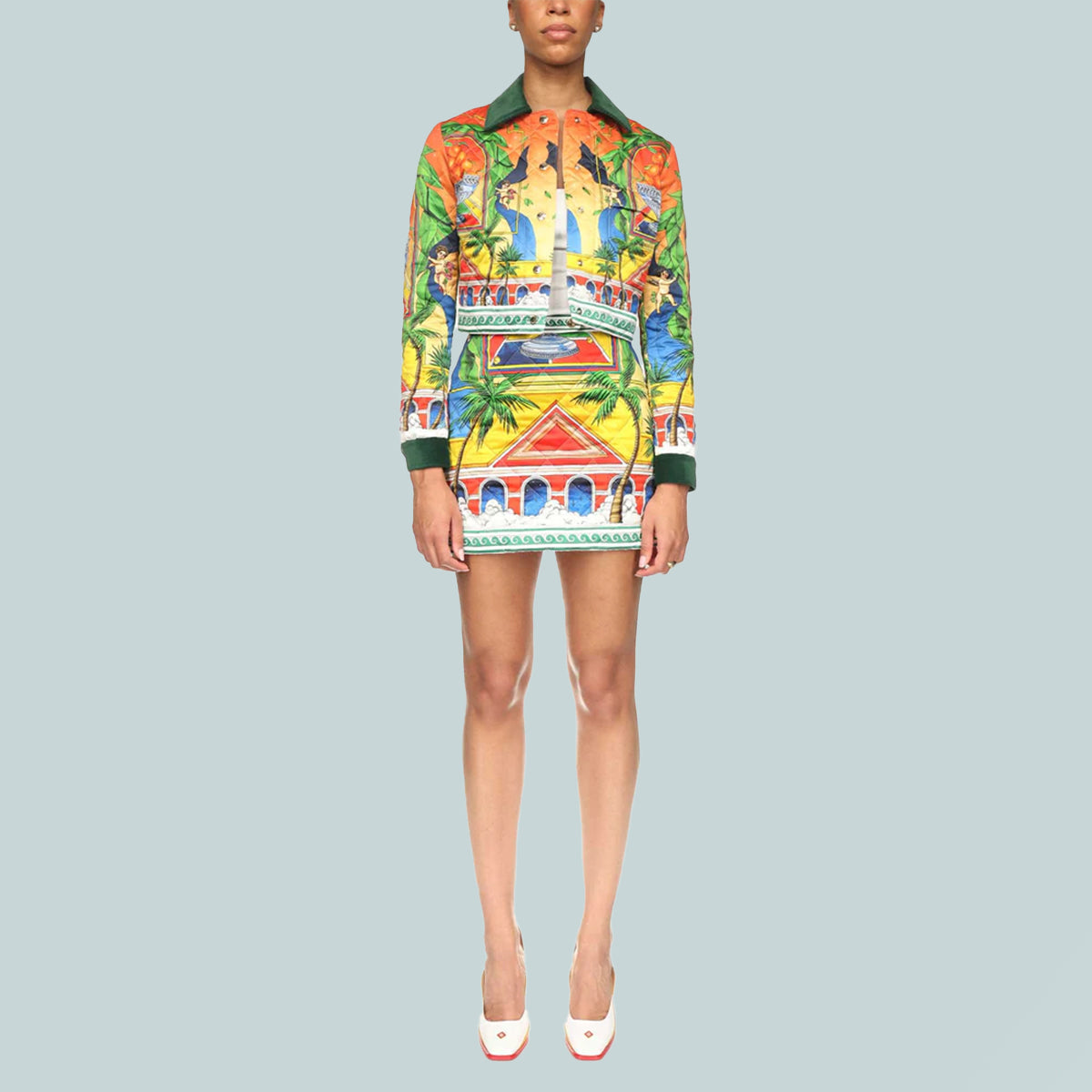 The Triomphe D'Orange Quilted Cropped Jacket is a multi-coloured printed short style featuring the house's classic iconographic artwork depicting the orange pyramid. Crafted from a printed satin fabric, this piece is completed with a contrast collar and cuffs, gold-plated press stud hardware, and a Casablanca branded label.