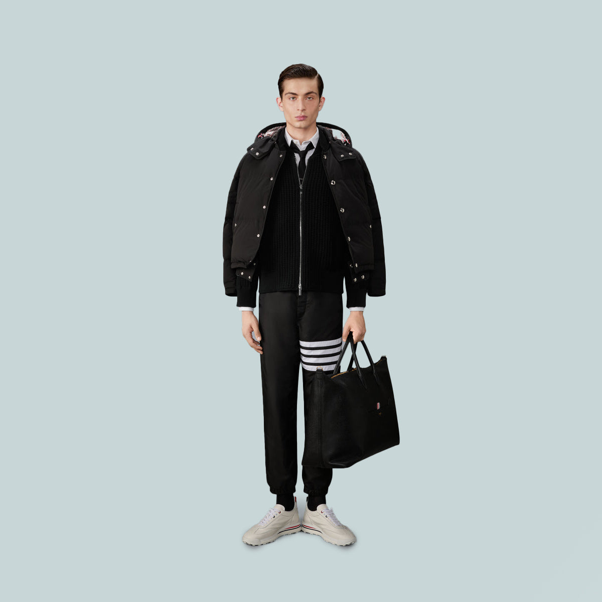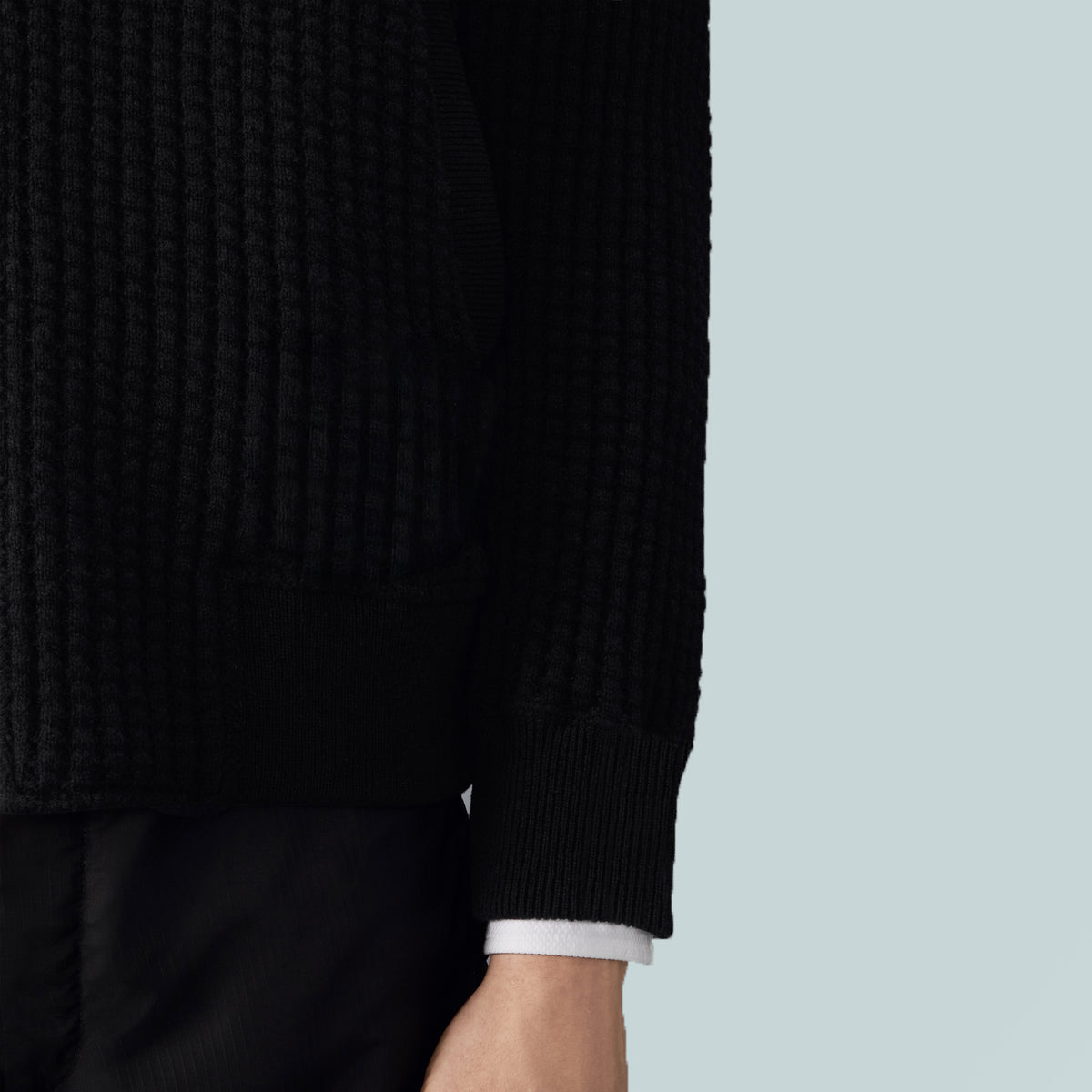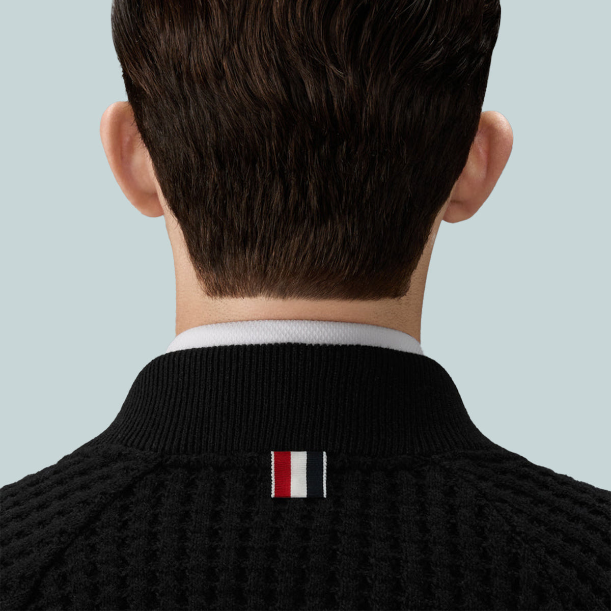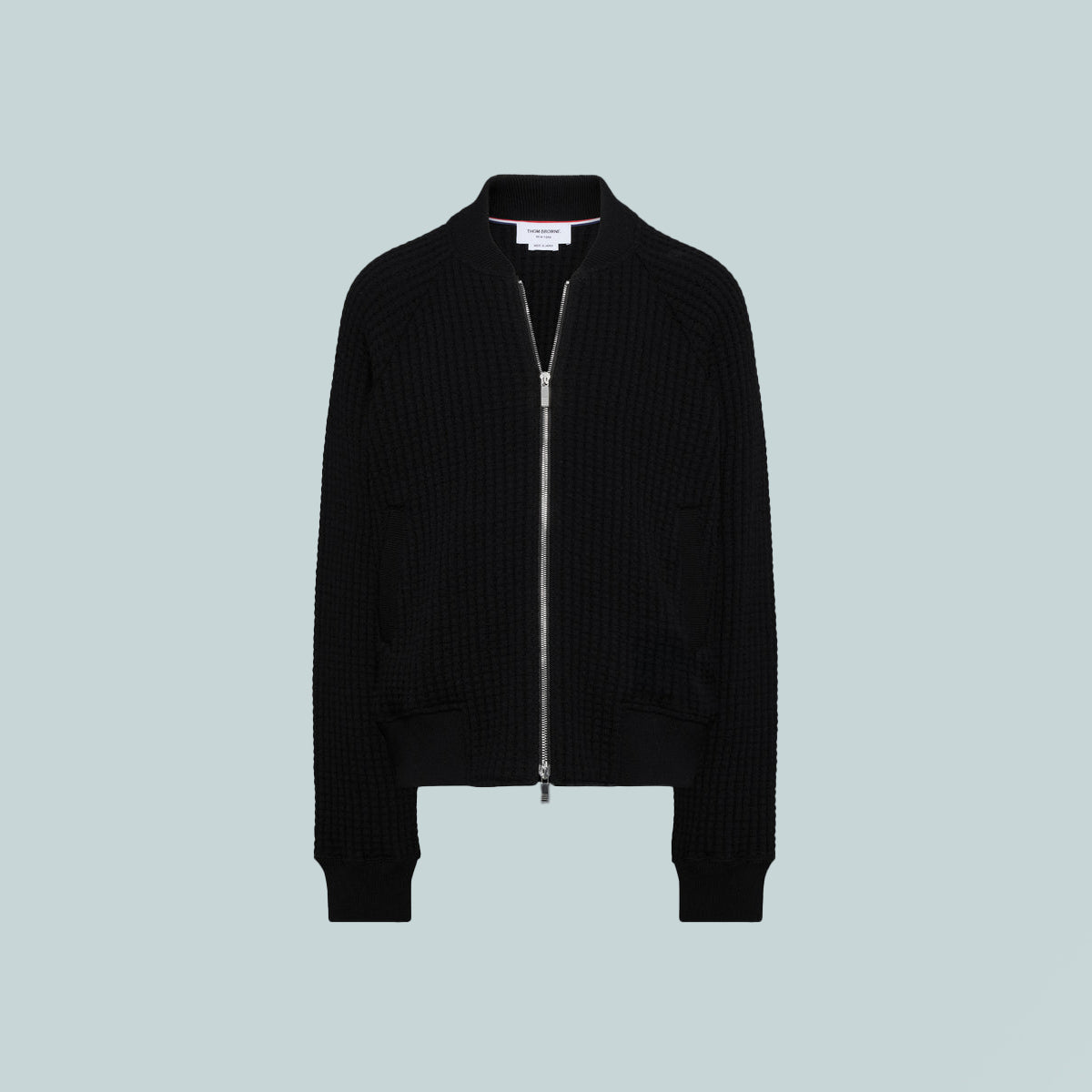 This bomber jacket is knit in chunky wool waffle for warmth and a tactile surface. Raglan sleeves and fully fashioned trims shape the silhouette with ease. Style with the Lightweight Shiny Ripstop 4-Bar Track Pants for a blend of structure and sport.