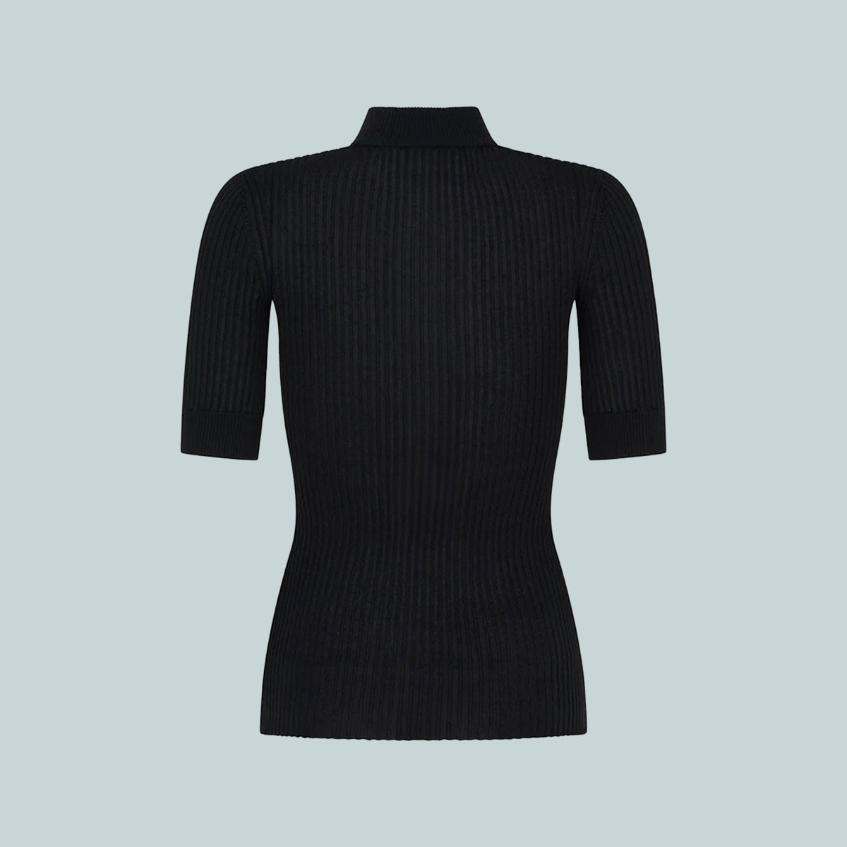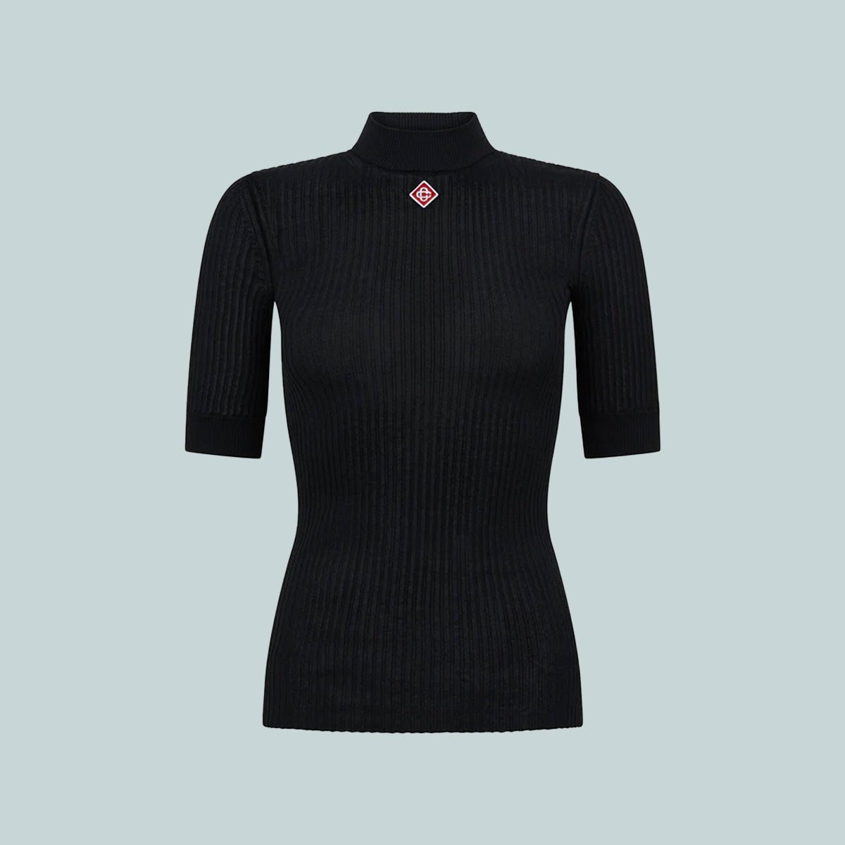 The rib high neck top is a black short-sleeve design crafted from a knitted cotton blend fabric featuring the house's signature diamond logo. Completed with a high neck, and ribbed cuffs and has been designed for a classic fit.