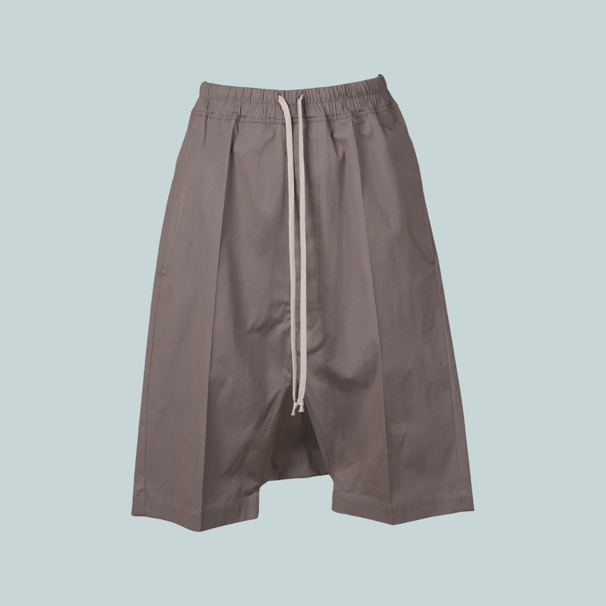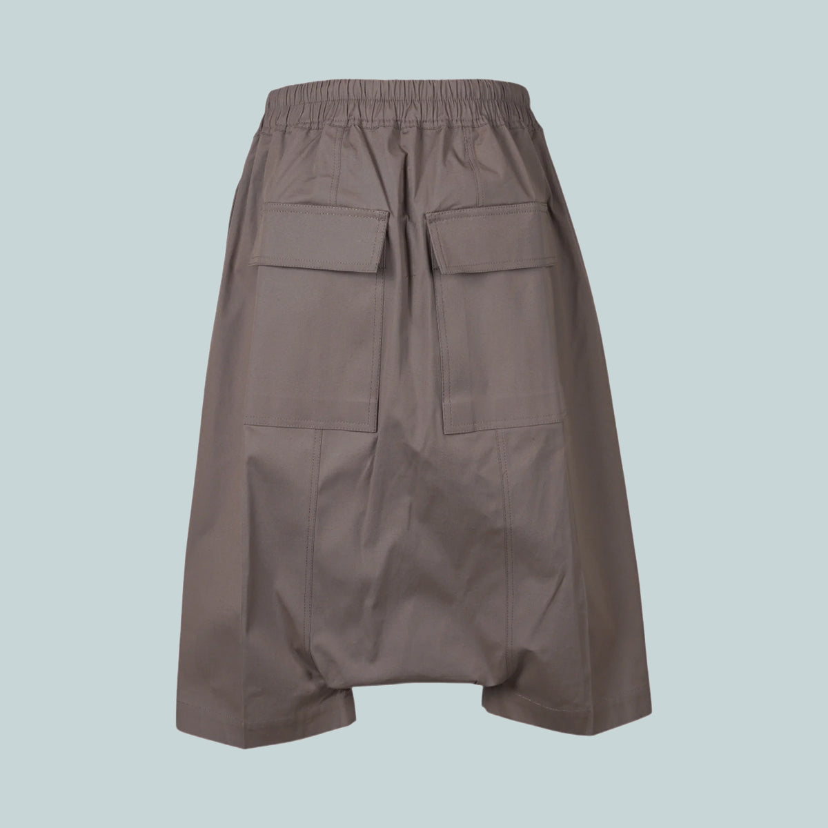 these rick's pods are below-knee length shorts with a low, dropped crotch. they have an elasticized waistband with drawstring, concealed fly, two side pockets and two square back pockets with flaps. they have a rounded panel between the legs and double topstitching.