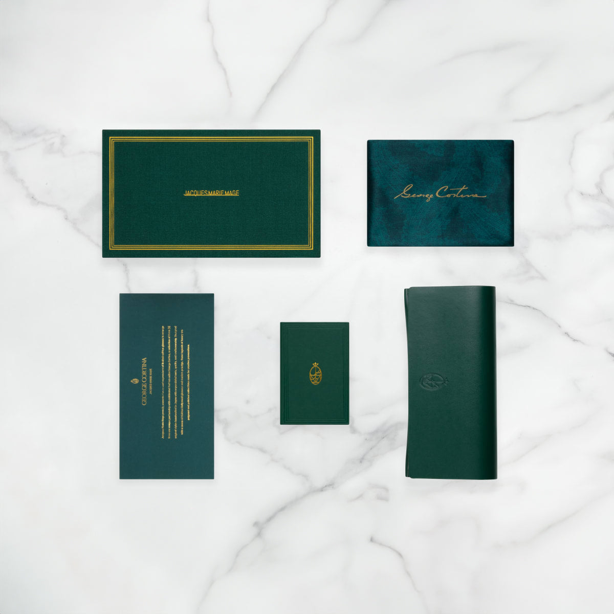 - George Cortina monograph box in green silk fabric with warranty booklet