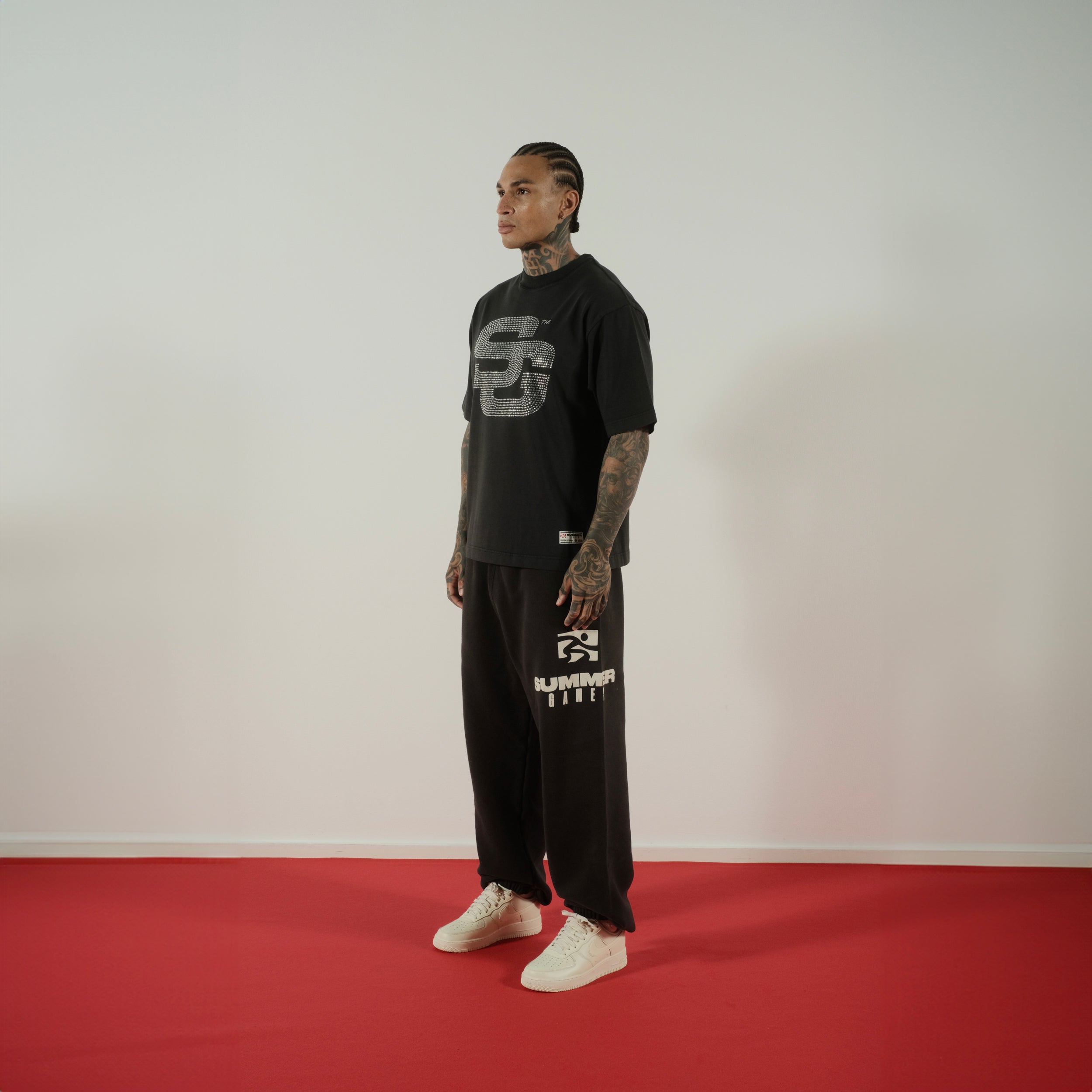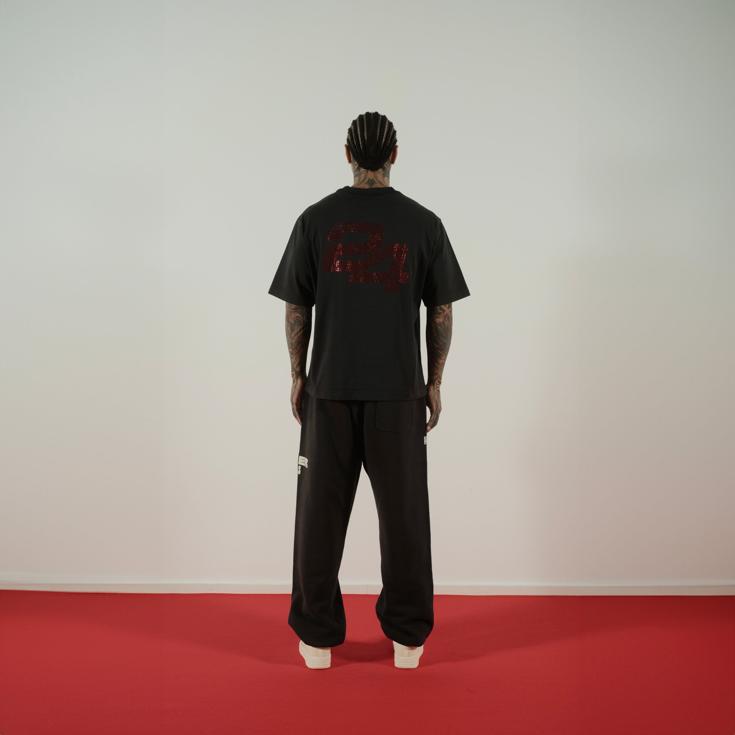 Athletic fitted tee made out of mid weight, ultra soft cotton jersey with rhinestones print and brand tag.