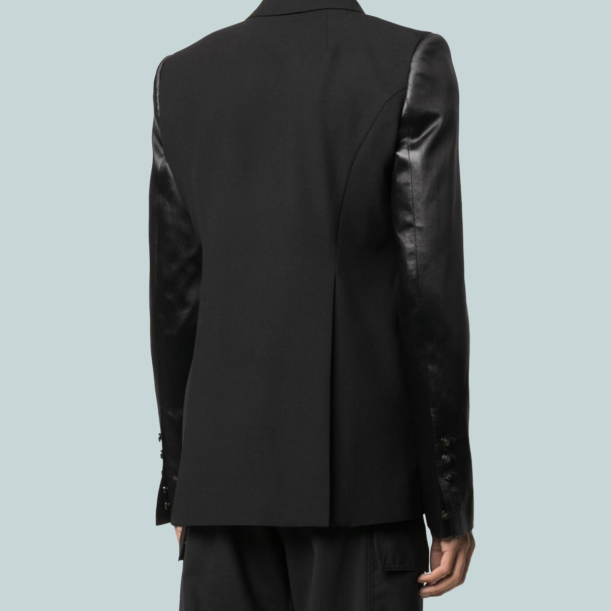 The Sharp Jacket with a below the hip length, features a single button closure, black Murray geometrical lapel tux detail, a collar, two jetted pockets, back slits and five button cuffs. Made from a wool viscose blend crepe woven in Italy.