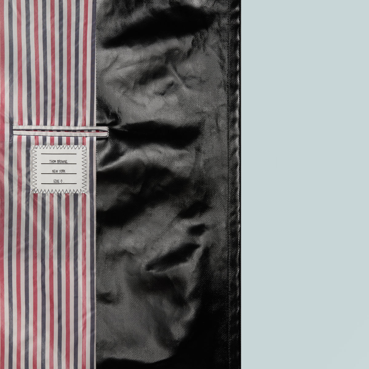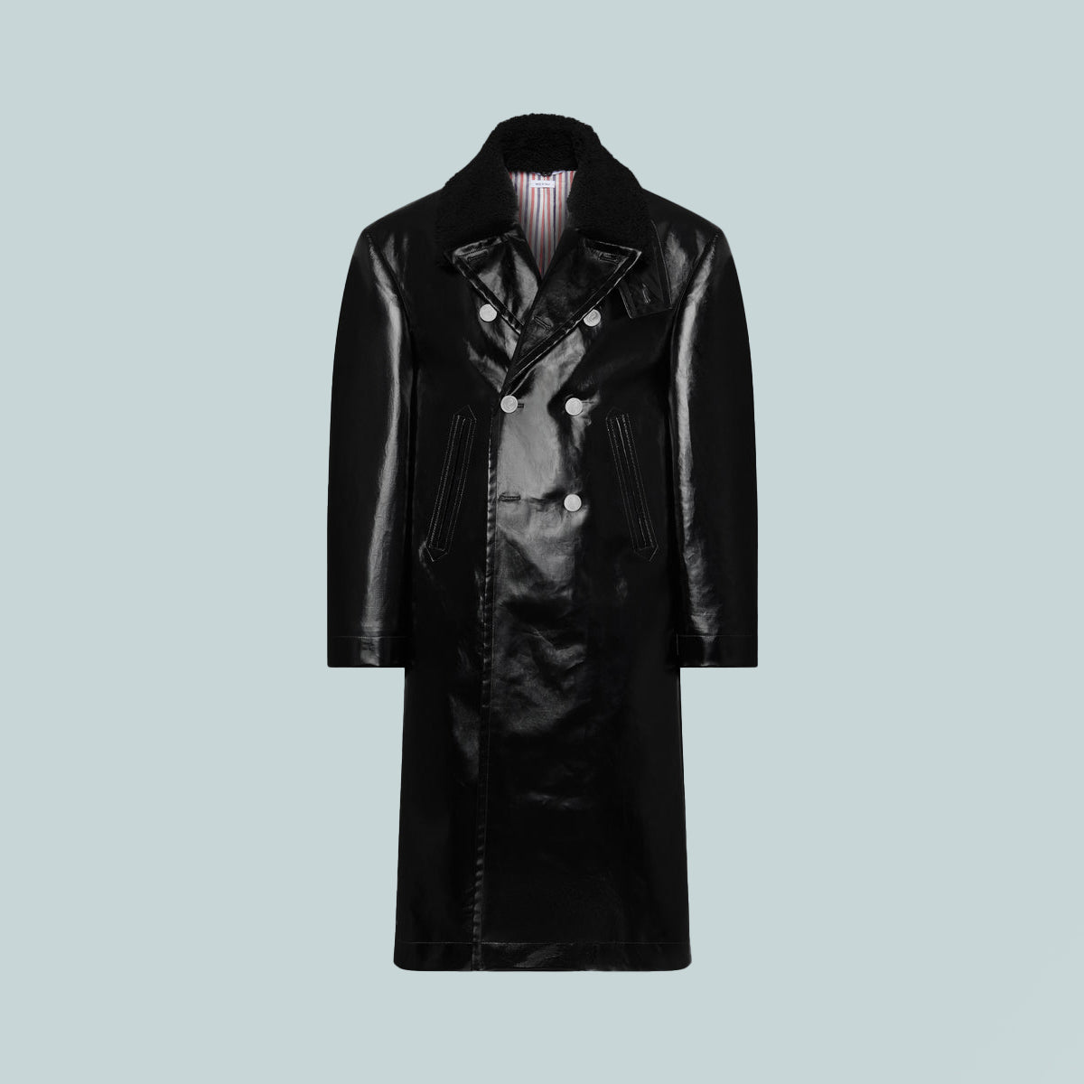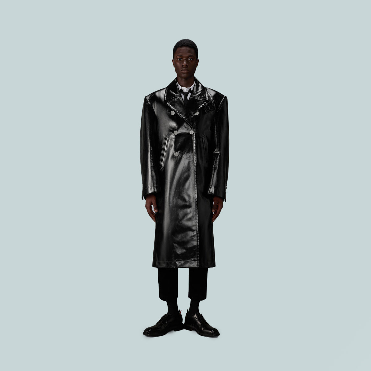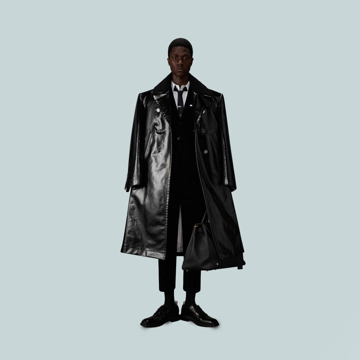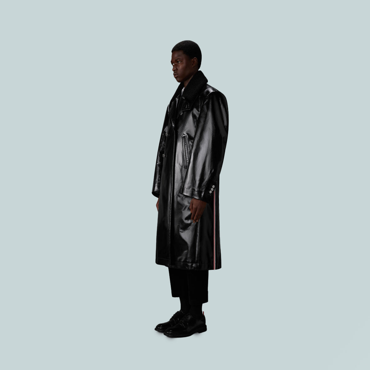 This oversized slicker coat is cut in structured gabardine, redefining classic outerwear through scale and construction. A detachable shearling collar lined in tricolor twill introduces a tactile contrast that softens the silhouette’s graphic clarity. Worn over suiting, it offsets fitted tailoring with bold, architectural volume.