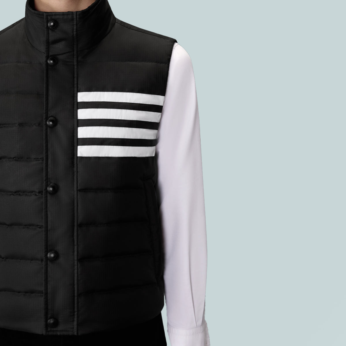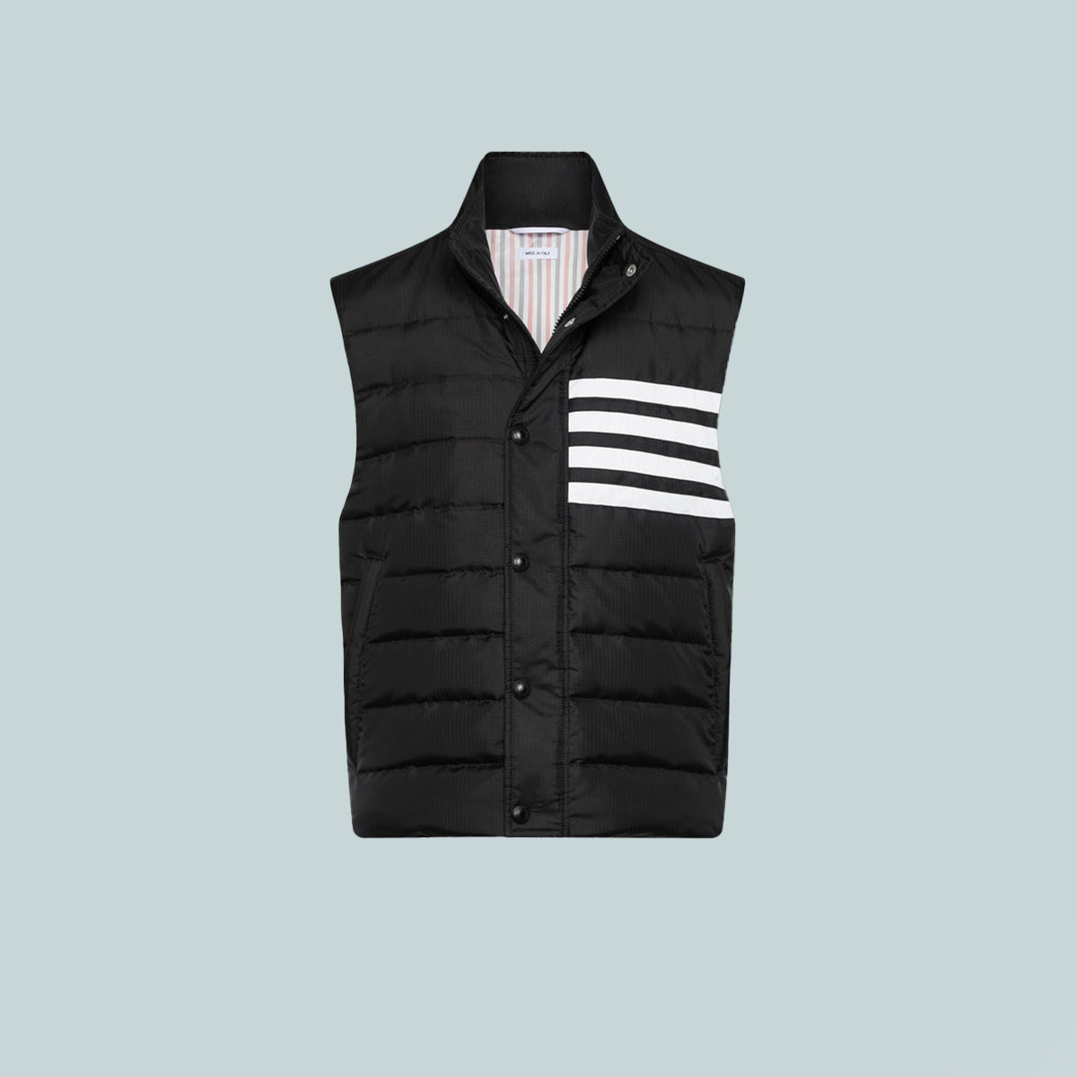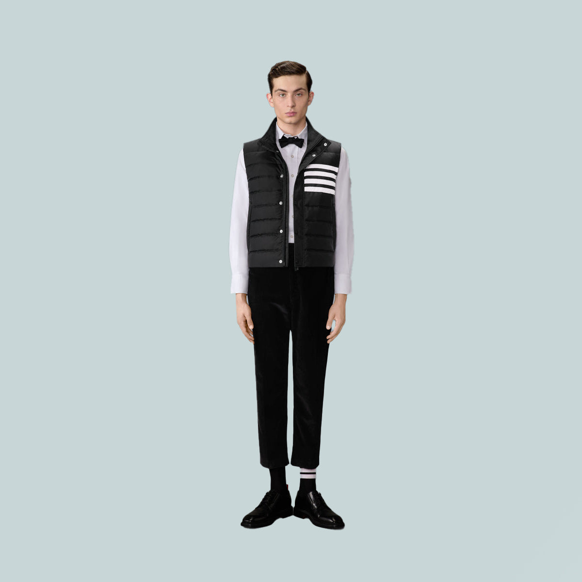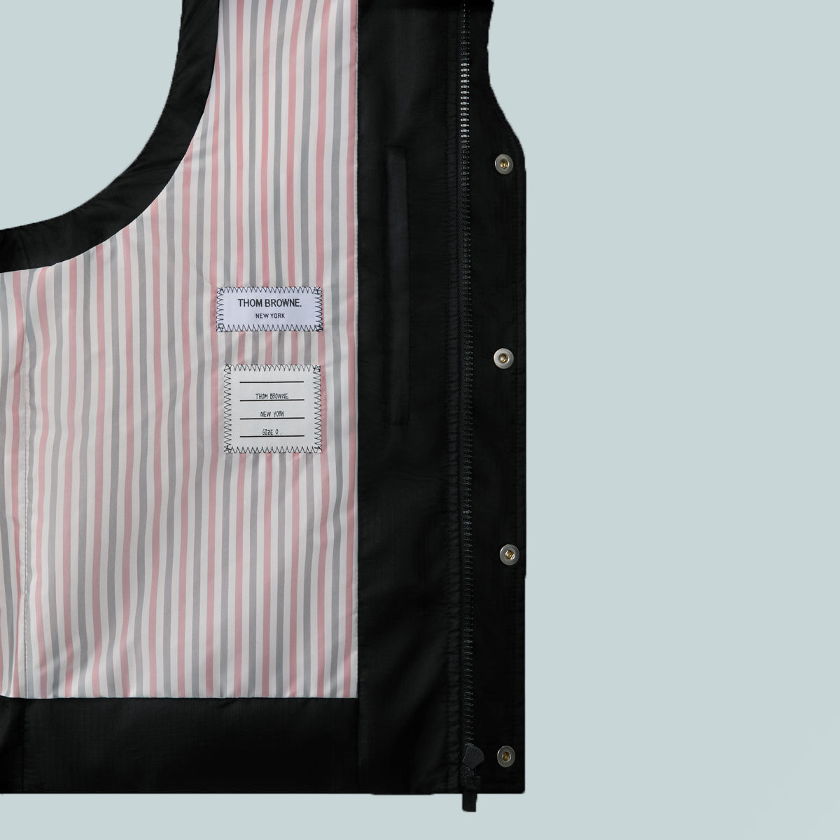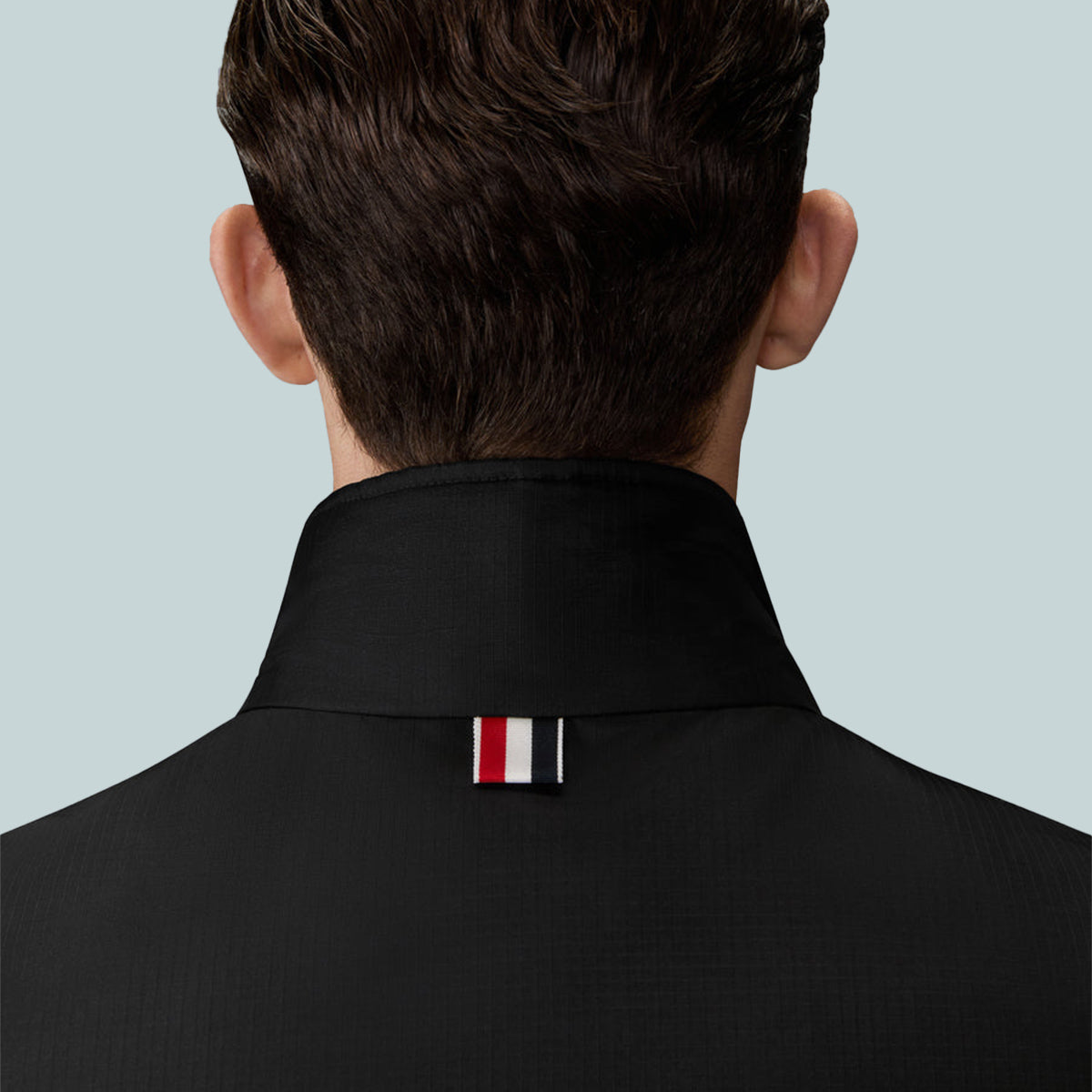 Shiny ripstop enters the collection as a lightweight, weather-resistant fabric, crafted into a down-filled vest that balances warmth with tailored structure. A subtle sheen and durable grid texture add depth, while 4-bar detailing anchors the piece in Thom Browne’s signature language. Complete the look with the season’s All-Terrain Boot—blending rugged function with elevated design.