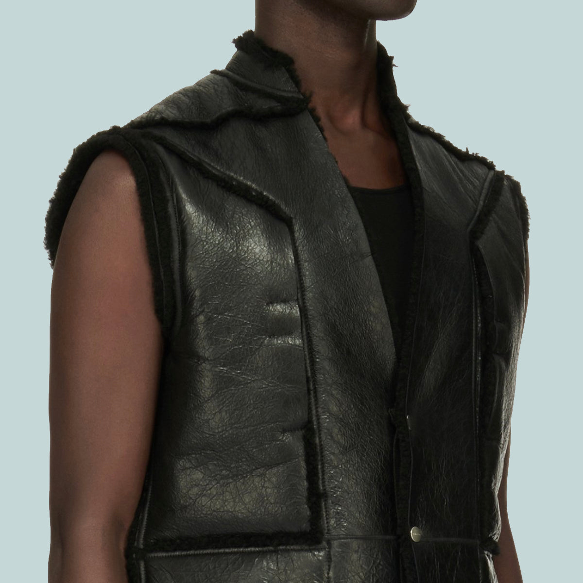 This version is made of shearling with the fur facing outwards, it has raw cut sleeves and its hem is edged with rows of signature stitching lines.