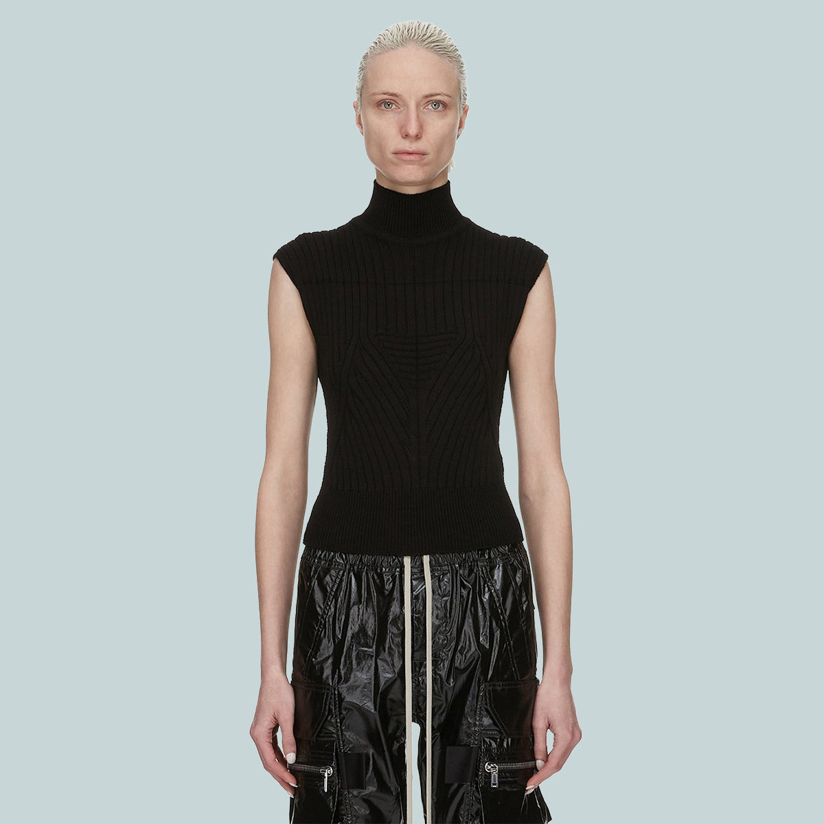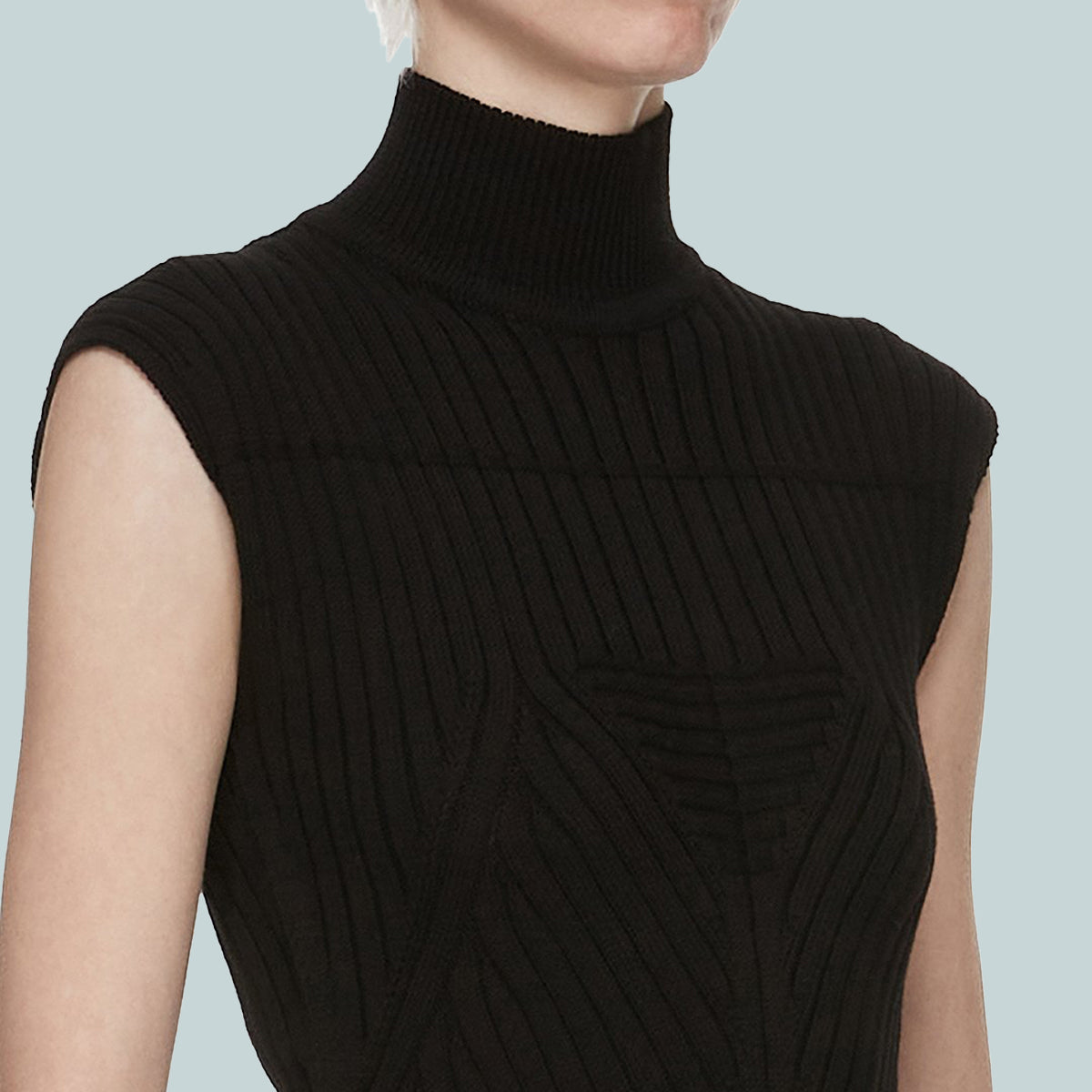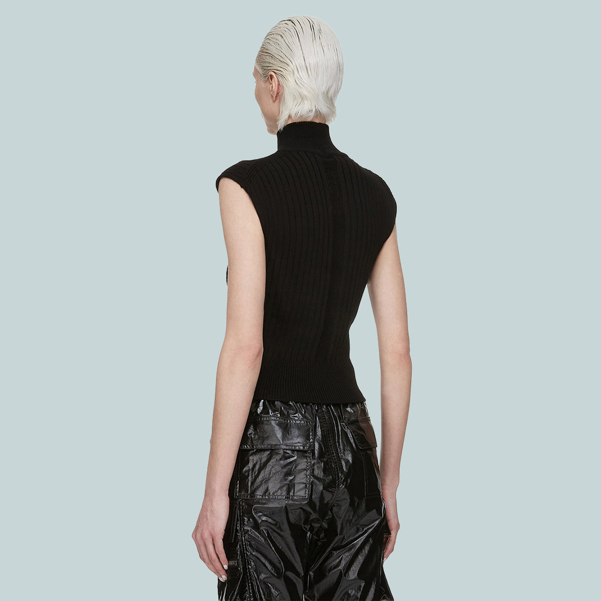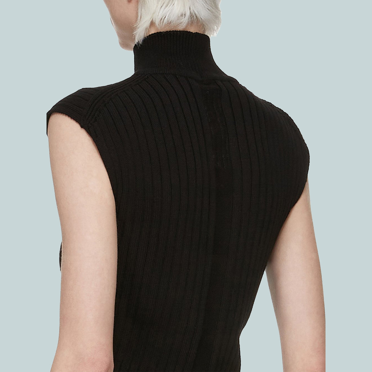 this sl turtle is above-hip length, it has wide shoulders and is sleeveless. it has a turtle neck and wide waistband in slim ribbing. it features a megarib knit design, with a wide vertical rib the back and front body, and diagonal lines running downwards into the center front. it has a vertical rib back with the signature knit channel running down the center back spine.